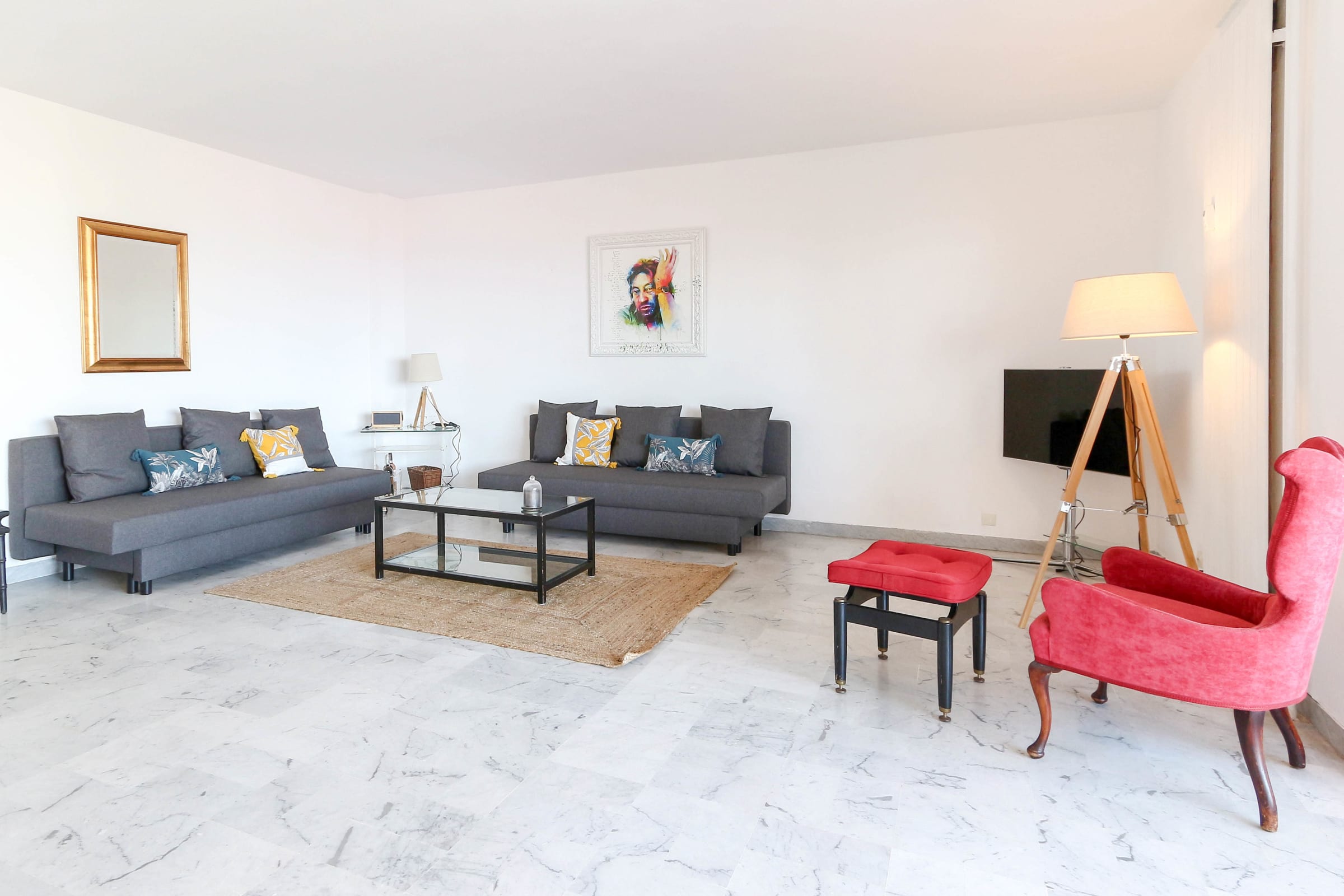 • LIVING ROOM: large living room with 2 quality convertible sofas, sleeping 140x190 each, dining area for 6 people, flat screen TV, terrace access with a magnificent sea view!
