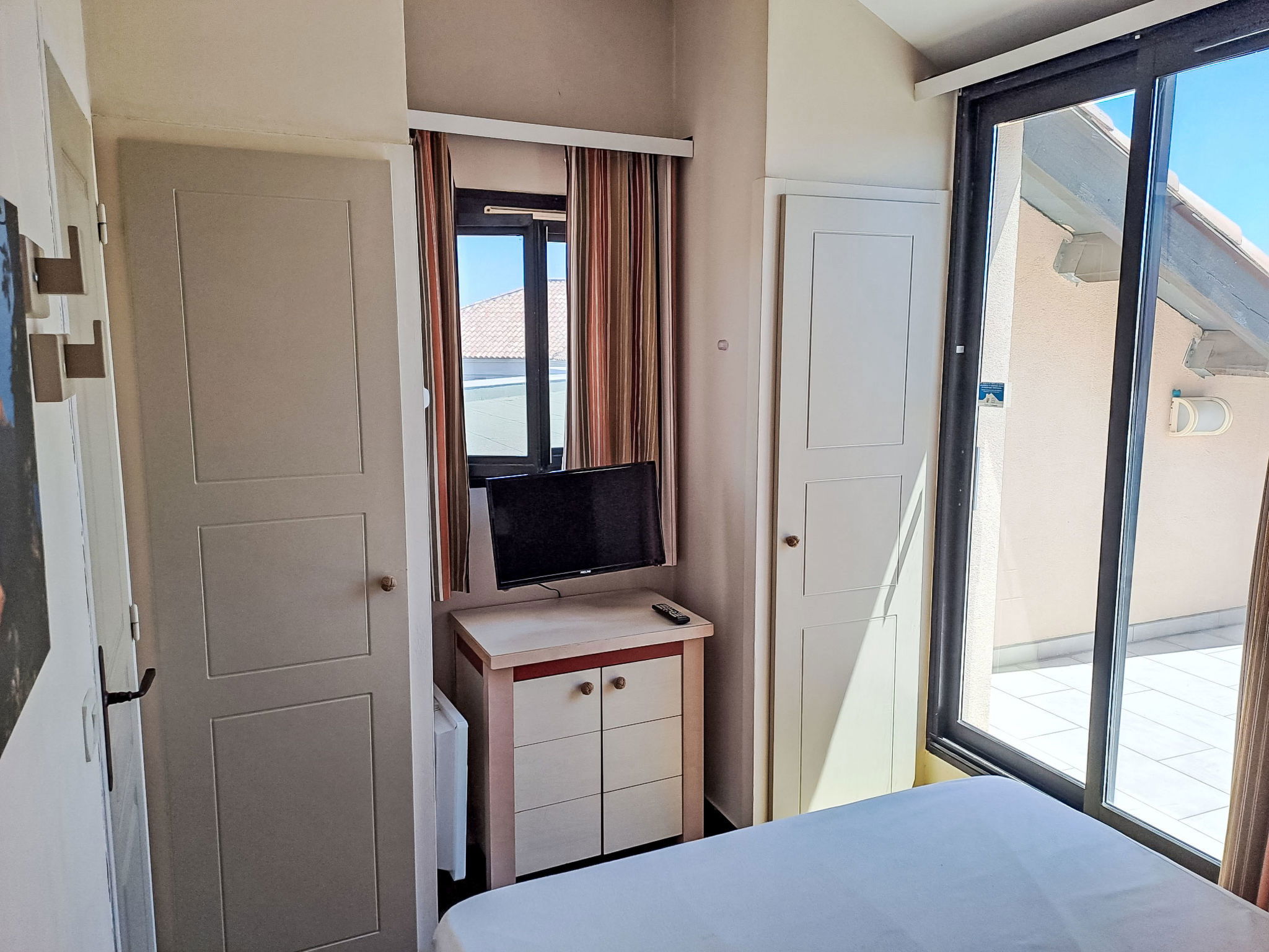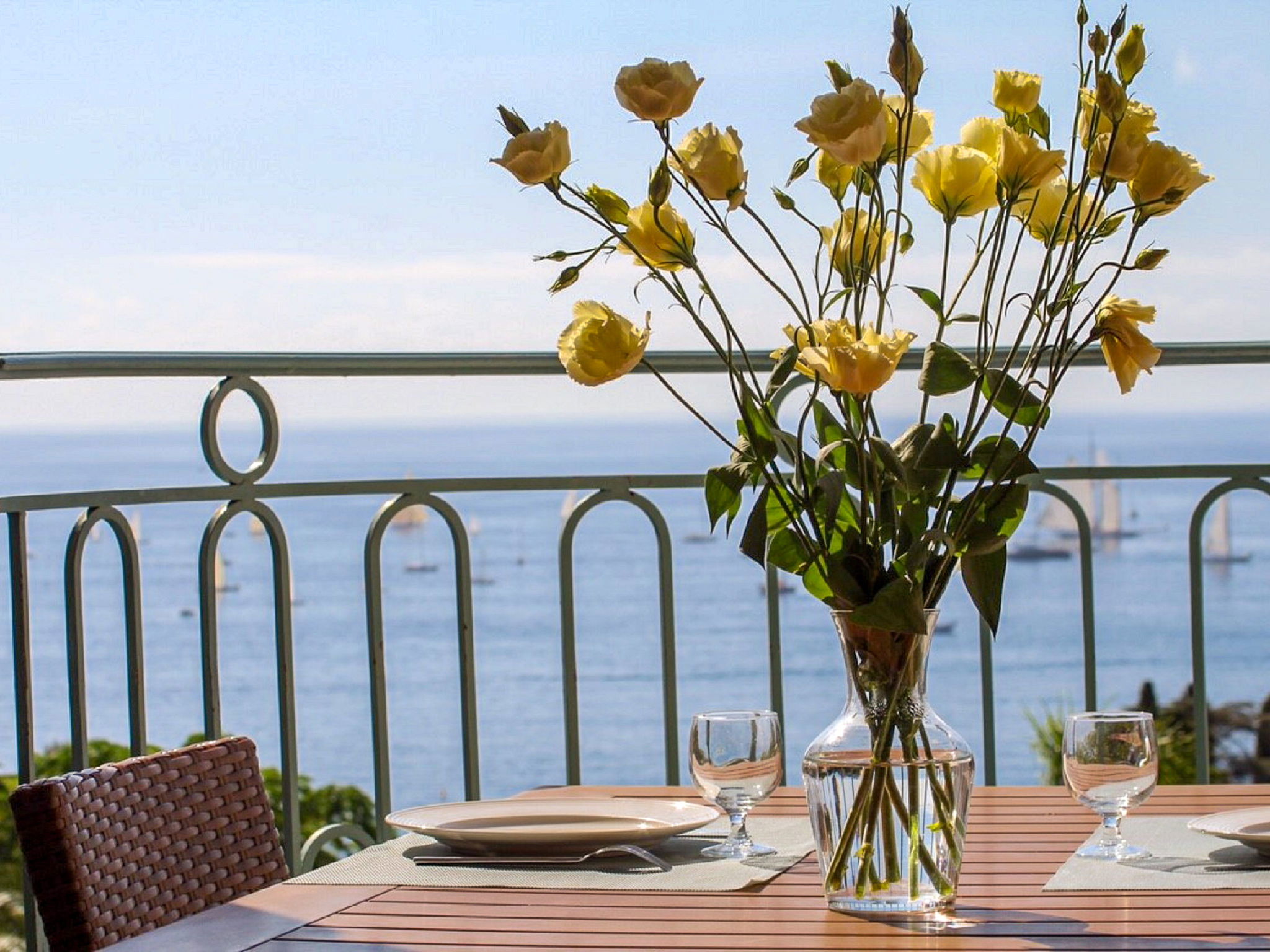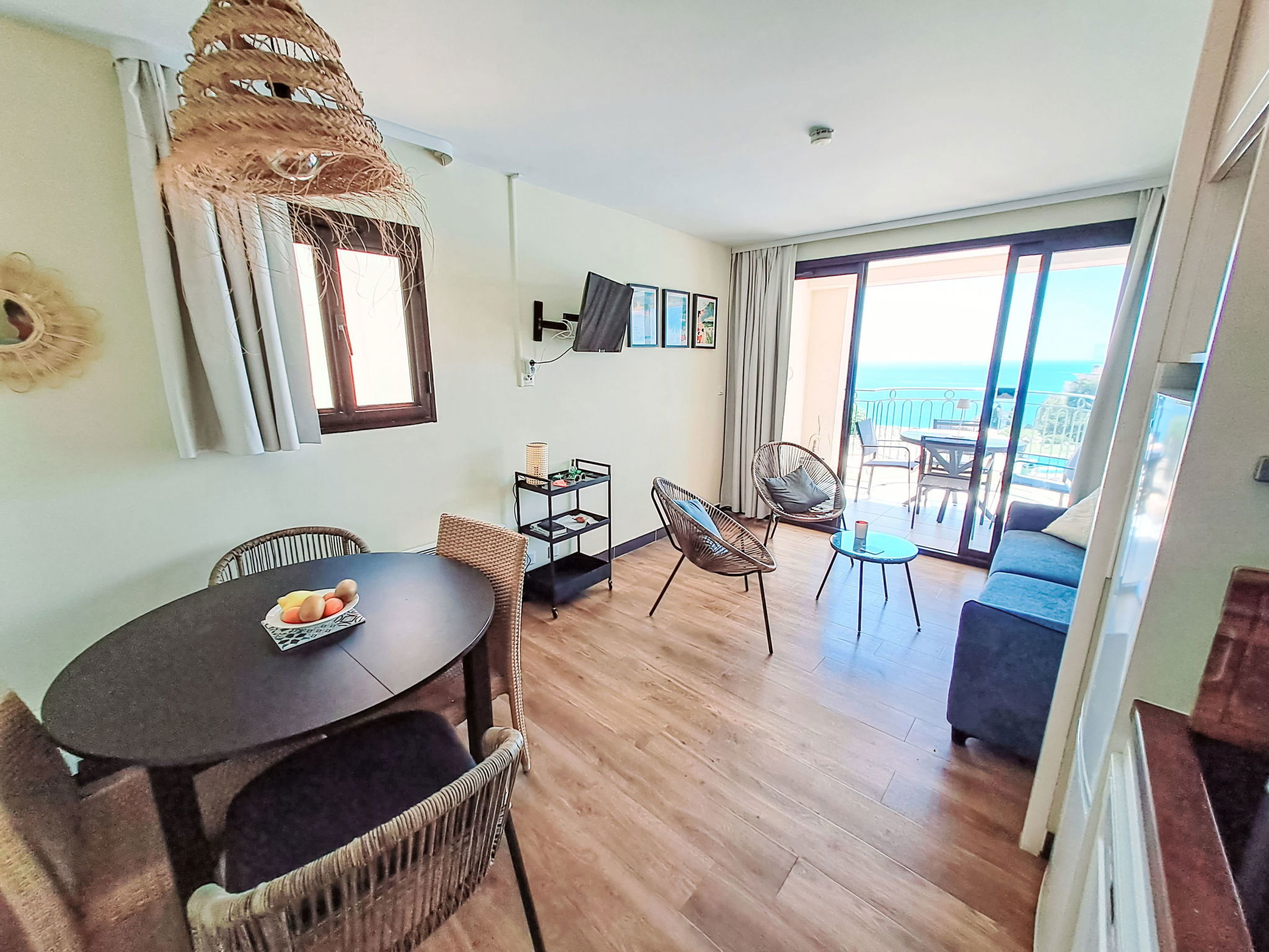 3-room maisonette 40 m2 on 2nd floor. Comfortable and beautiful furnishings: living/dining room with panoramic window with TV and air conditioning. Exit to the terrace. 1 small room with 1 x 2 bunk beds (90 cm, length 190 cm). Open kitchen (dishwasher, 4 induction hot plates, microwave, electric coffee machine). Shower/WC. Electric heating. Upper floor: 1 room with panoramic window with 1 french bed (1 x 140 cm, length 190 cm), TV. Exit to the terrace. Bath/WC. Terrace 10 m2, terrace 15 m2. Terrace furniture. Very beautiful panoramic view of the sea and the swimming pool. Facilities: washing machine. Internet (WiFi, free). Please note: smoke alarm. 06029013282AK