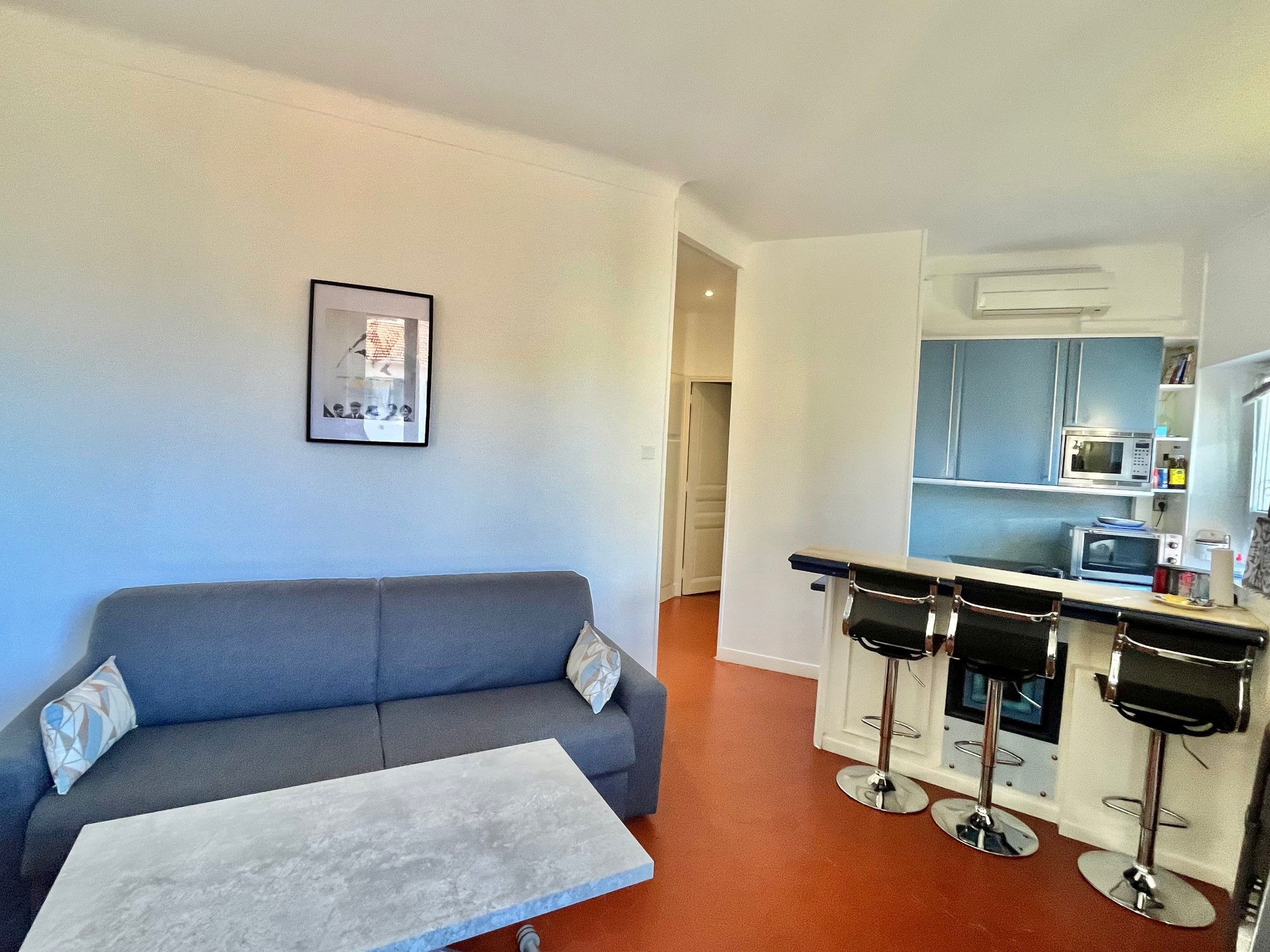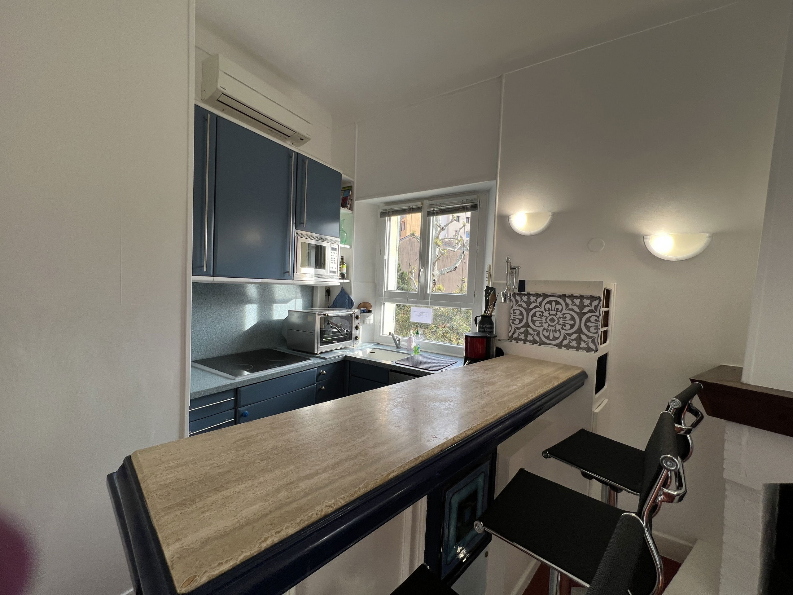 In the heart of the historic district of Cannes and 5 minutes walk form the Croisette, 2 room apartment on the 3rd floor without lift, offering a living room with sofa bed and open kitchen with view on the roofs, a renovated shower room with toilet and a bedroom with 2 single beds.