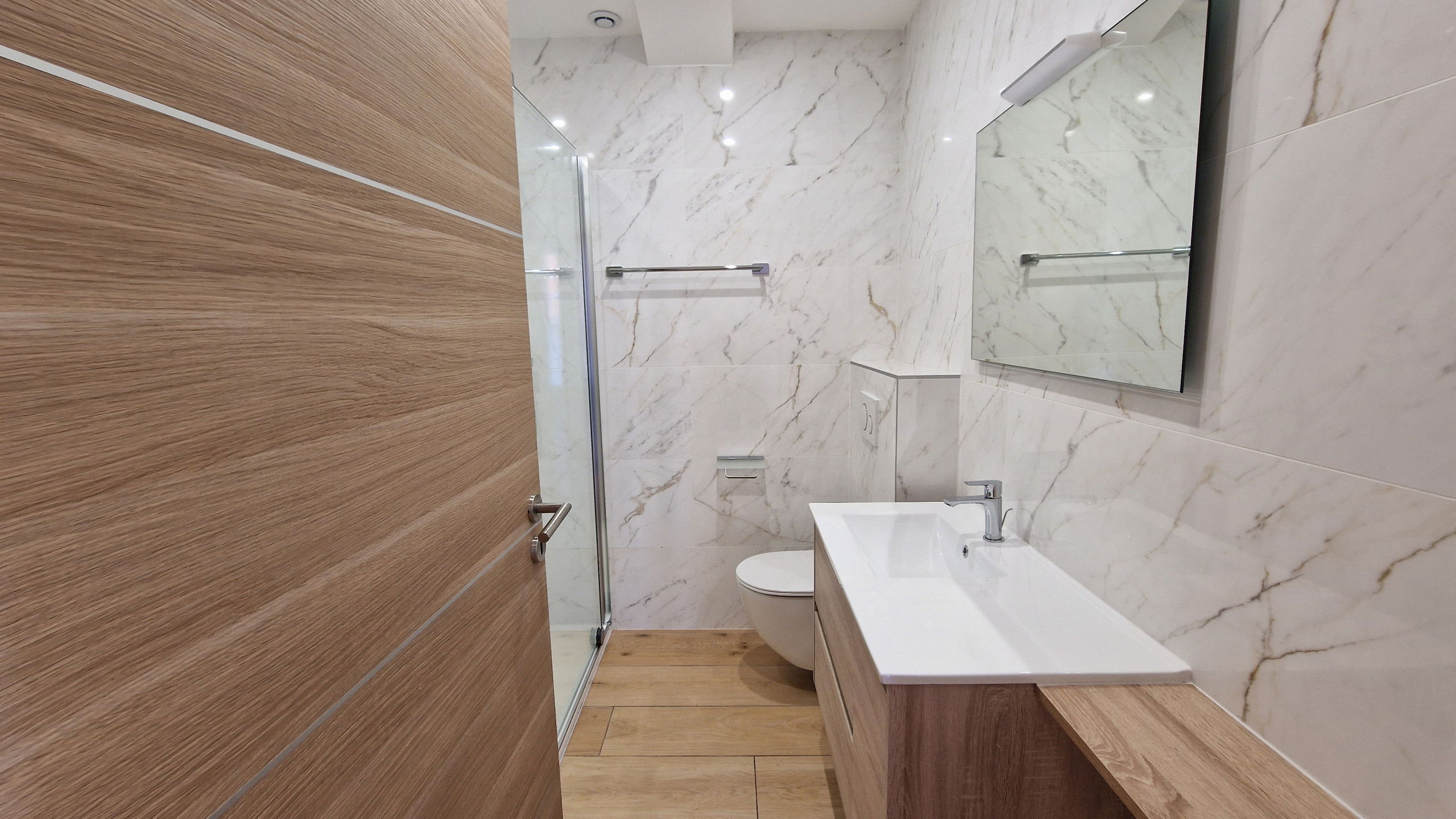 The apartment features two comfortable bedrooms, providing accommodation for four people. The bedroom is furnished with a double bed and an en-suite shower room, while the second bedroom also offers a double bed and benefits from an independent shower room with toilet. Additionally, a guest toilet is also available.