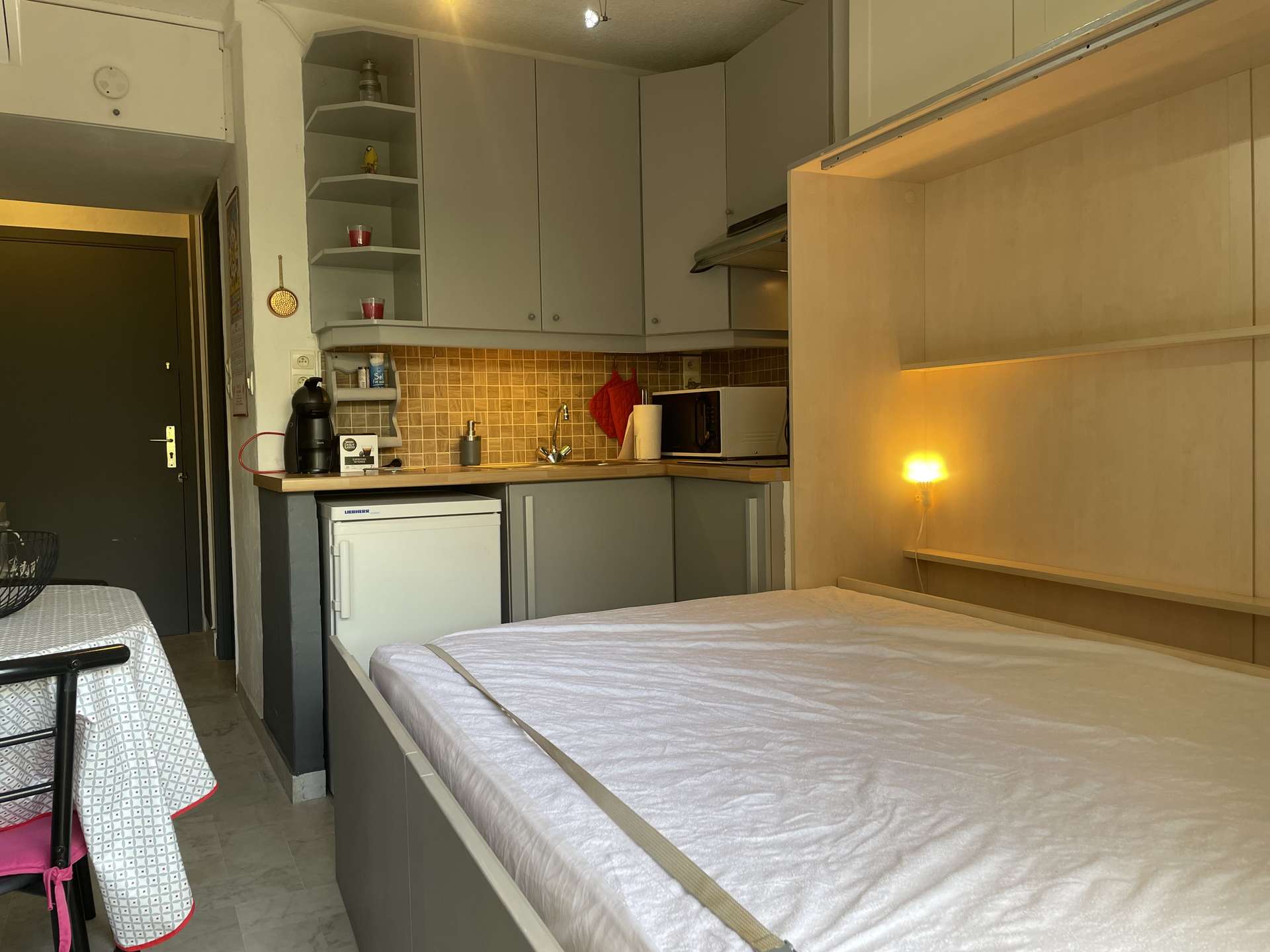 Cannes la Bocca (06) - Residence LA LICORNE Studio apartment - approximately 15 m2 - up to 2 people Located near the beaches, this residence will seduce you with its location facing the sea, shops, town centre. Your holiday apartment on the ground floor includes an entrance hall, a shower room with wc, a living room with an equipped kitchenette, a retractable bed opening onto a terrace with furniture. Cleaning with disinfection included. Possibility of a parking space in a nearby residence. The advantage of this vacation rental: private parking space, private access to the beaches, quiet residence.