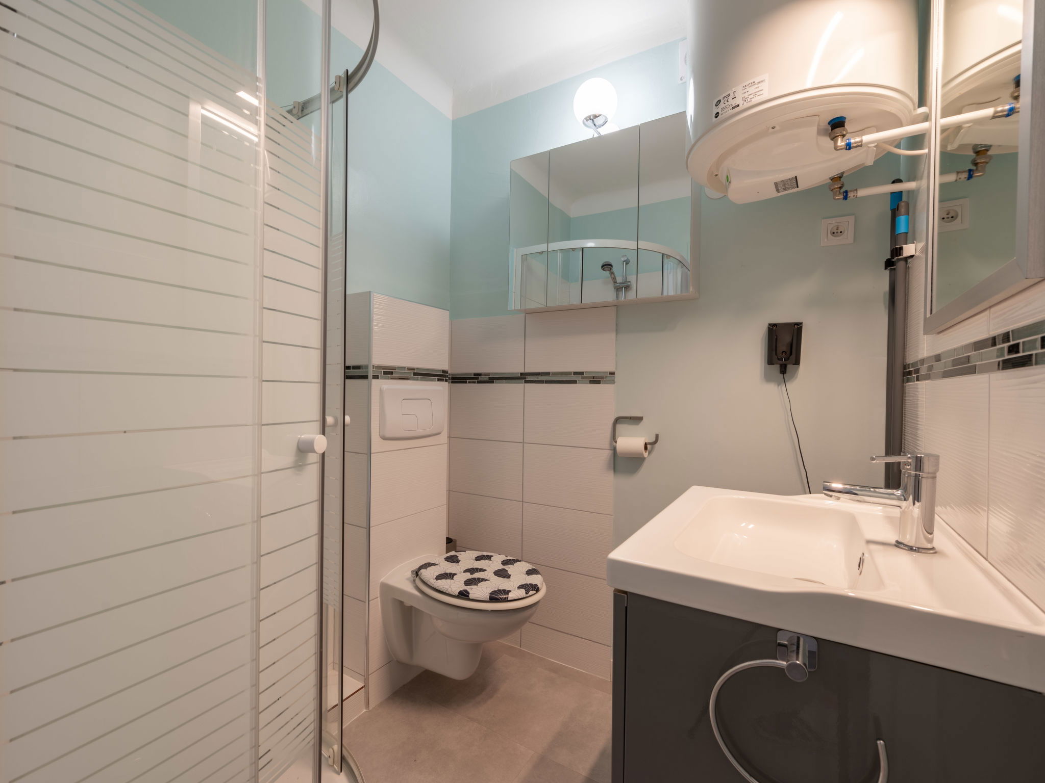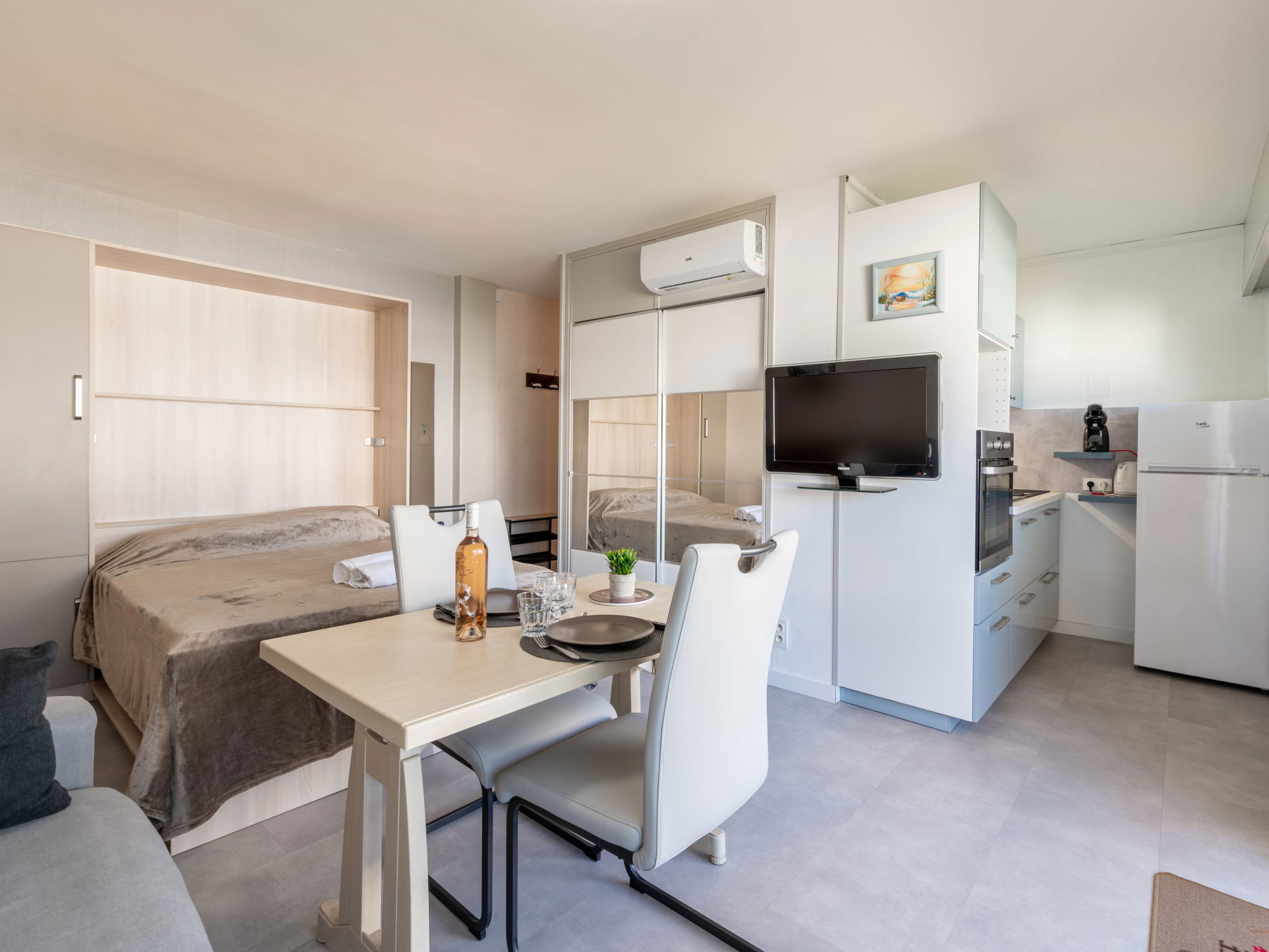 1-room apartment 22 m2 on 2nd floor. Comfortable furnishings: living/dining room with 1 double wall-trunk bed (140 cm, length 190 cm), TV (flat screen), air conditioning. Exit to the terrace. Open kitchen (oven, 4 induction hot plates, toaster, kettle, microwave, freezer, electric coffee machine). Shower/WC. Air-conditioning, forced-air heating. Terrace 8 m2, south facing position. Terrace furniture. Facilities: Internet (WiFi, extra). Please note: non-smokers only. Smoke alarm. Offer by a private individual according to Art. 155, IV of CGI. 06029029203MX
