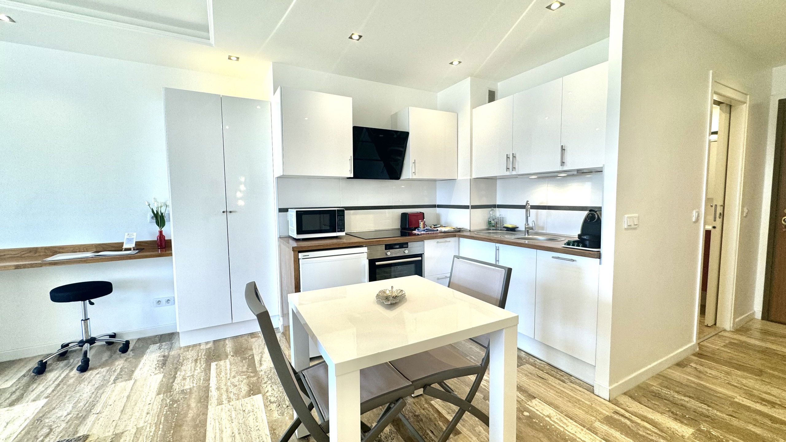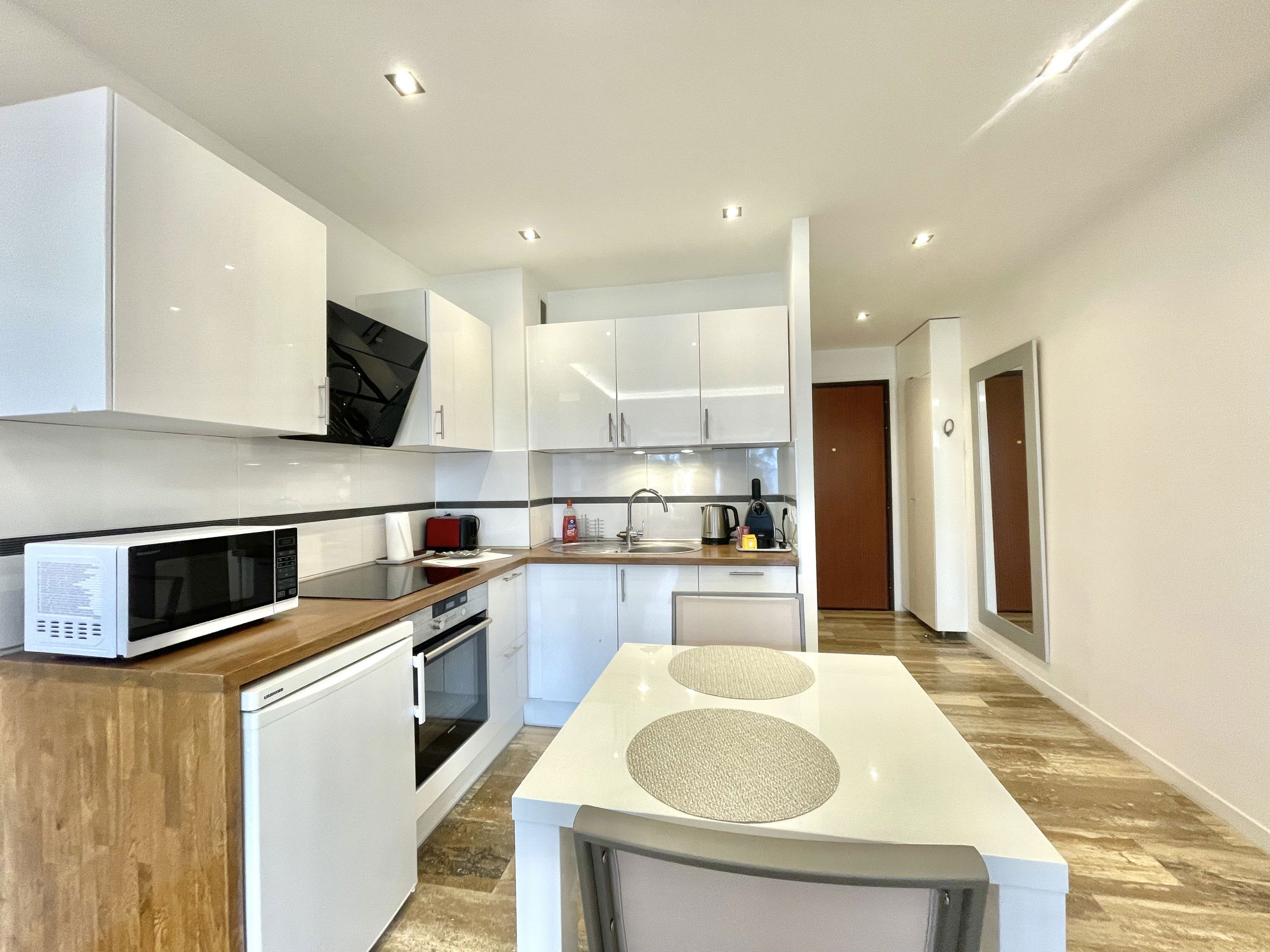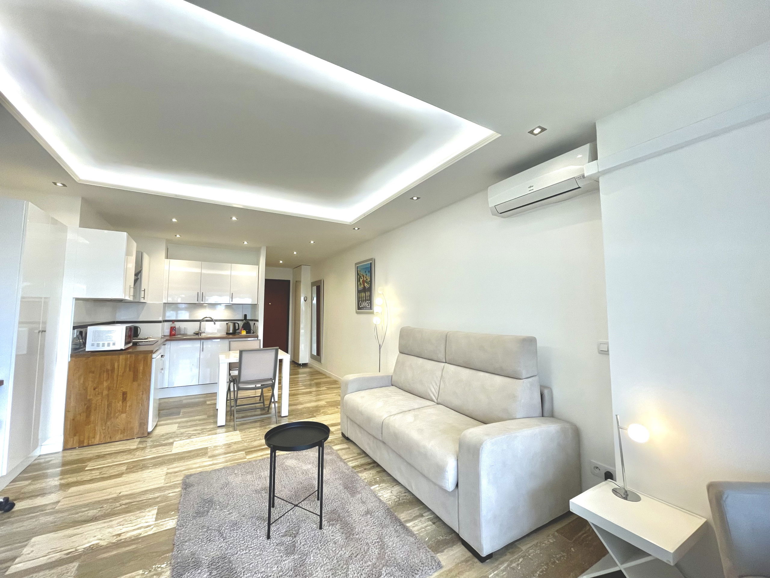In a renowned building on the Croisette near the Palais, this charming renovated 32 m² studio on a high floor offers a terrace with sea view and modern amenities with a bathroom including an Italian shower and separate toilets as well as a washing machine, the living area features a fully equipped American kitchen, a dining area and a workspace, the studio is equipped with Wi-Fi, air conditioning and a television, the new furniture and optimised layout maximise the space for a comfortable stay, the 8 m² terrace allows you to enjoy the outdoors and an unobstructed view of the sea, located a few steps from the sandy beach of the Croisette and in the immediate vicinity of restaurants, shops and transport, the SNCF train station and bus station are accessible on foot, this studio combines comfort, modernity and authenticity of the French Riviera in a calm and elegant residential environment.