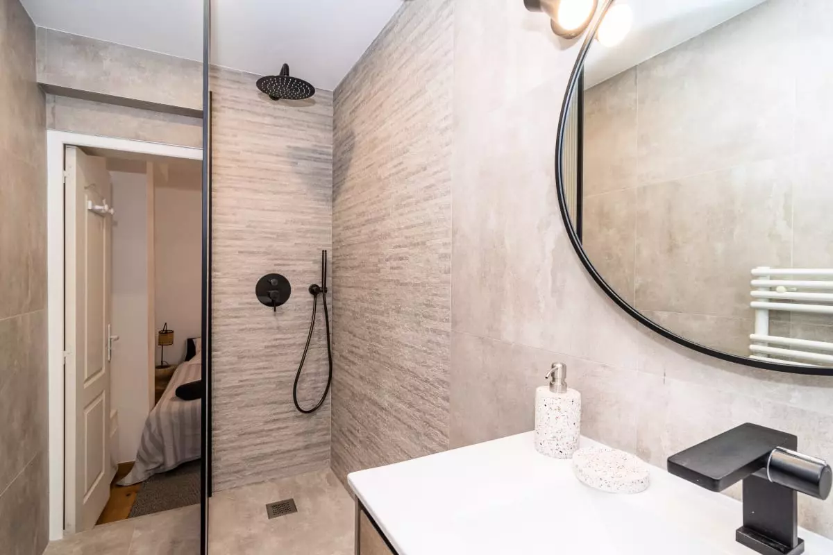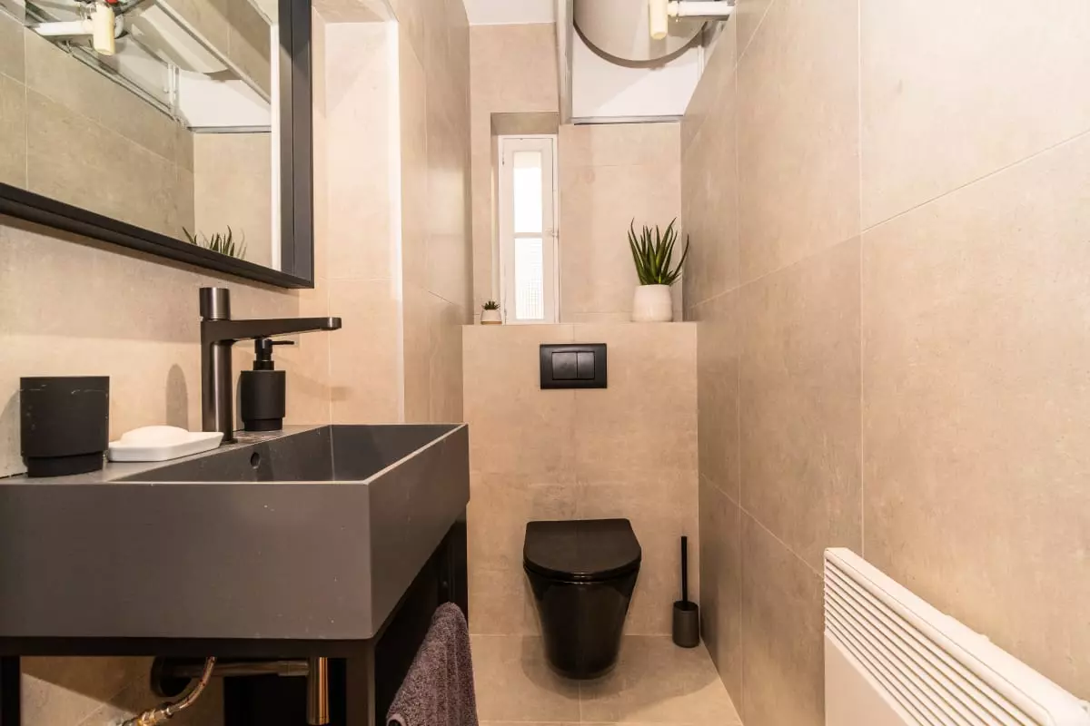 1 bathroom with shower (at the end of the passage to a bedroom) and 1 separate WC on the living room side.