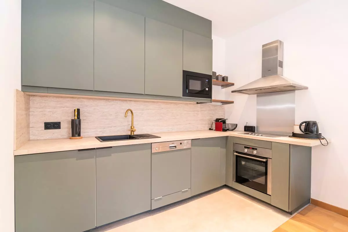 Beautiful amenities include two bedrooms with double beds and a spacious living room with a fully equipped open-plan kitchen (Nespresso coffee machine, dishwasher, hotplates, refrigerator). The living area includes a dining table, sofa, TV, and Wi-Fi throughout.