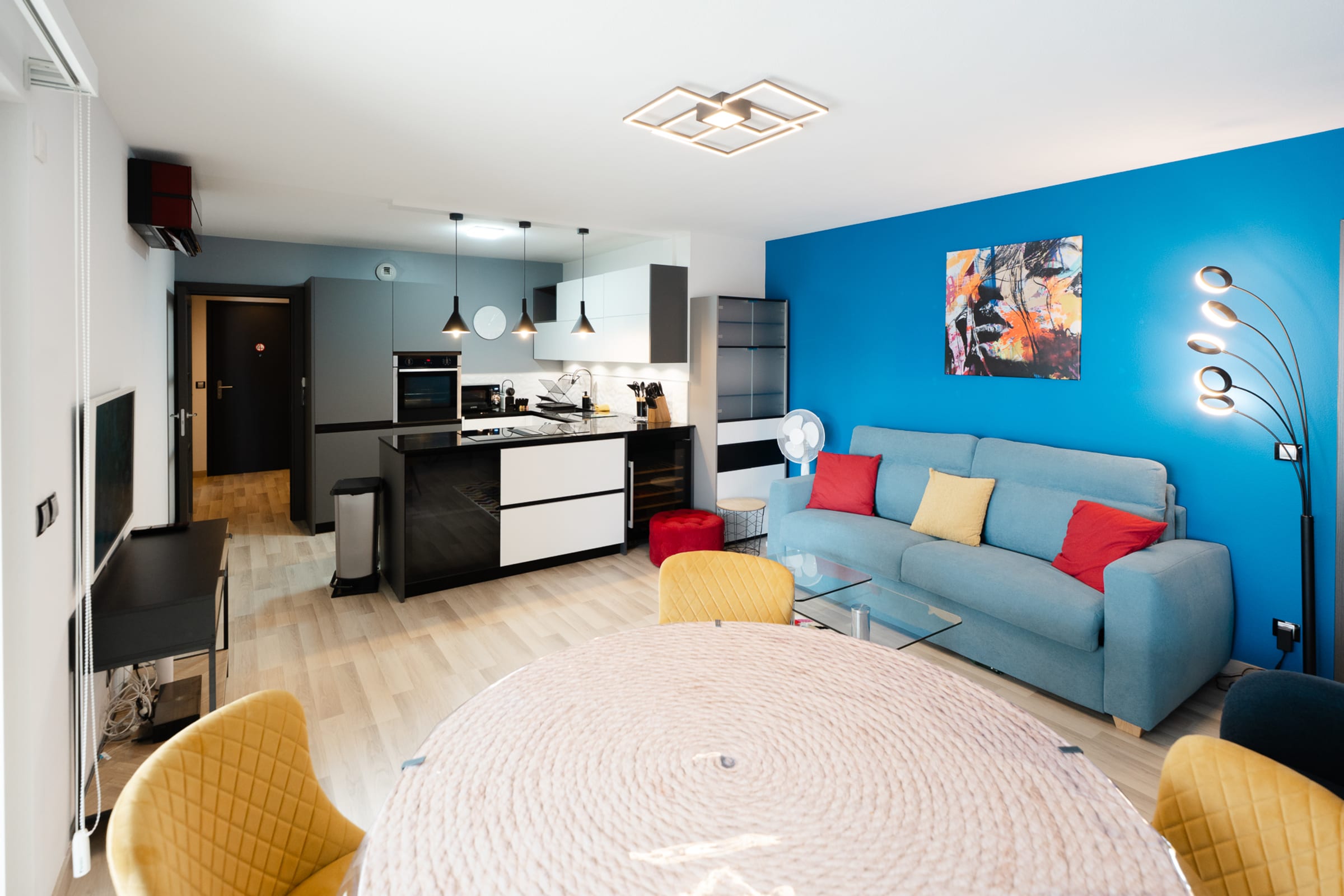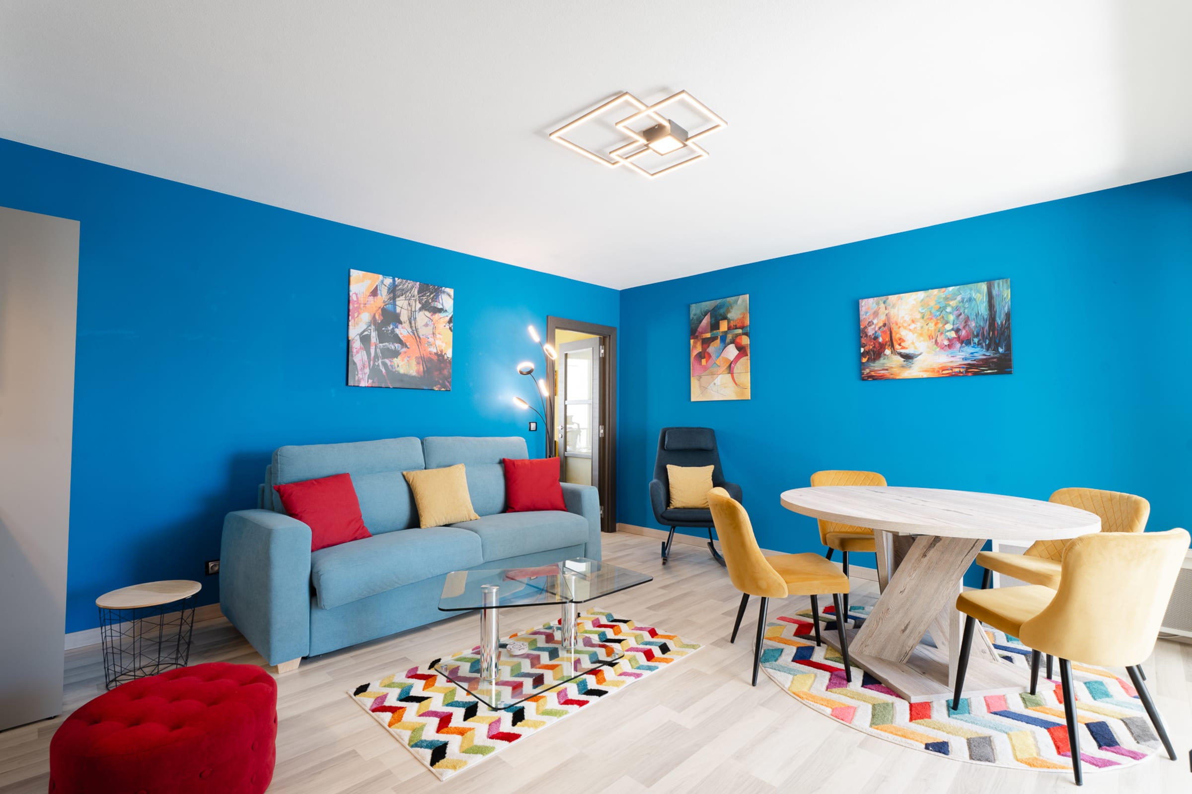 🛋 L'appartement, au 4e étage avec ascenseur, dispose d'un salon lumineux ouvert sur la cuisine et sur une belle terrasse équipée de transats et d’une table à manger.