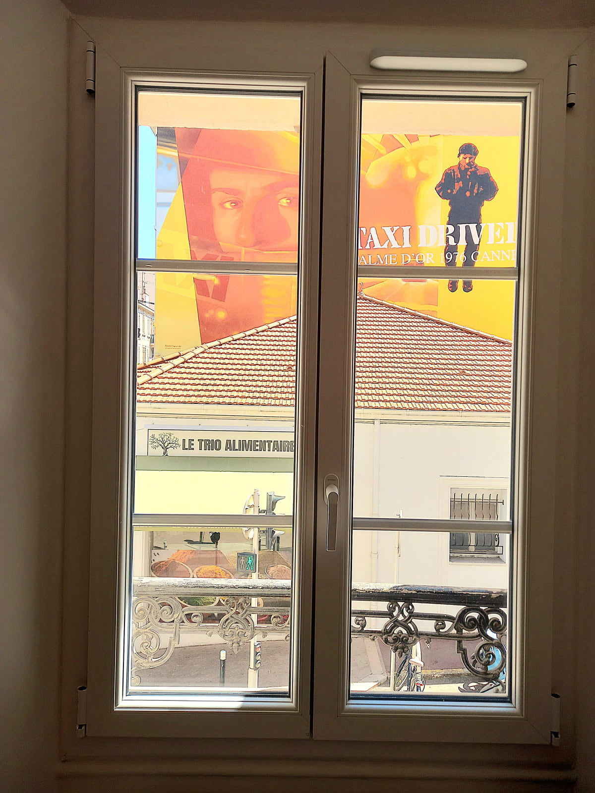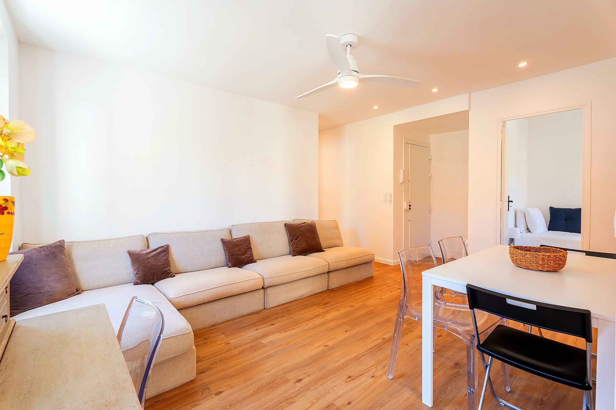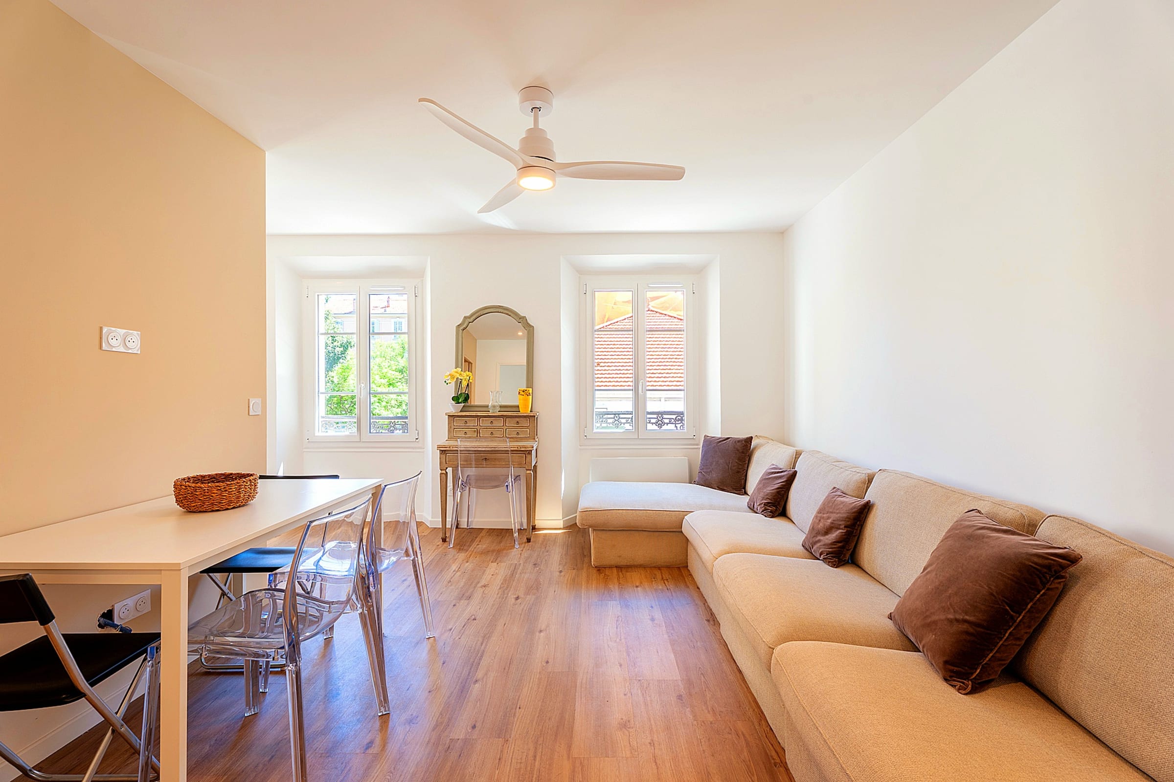 🛋 L'appartement, au 1er étage sans ascenseur, dispose d'un salon lumineux ouvert sur la cuisine avec ses fenêtres donnant sur une fresque cinématographique emblématique de Cannes