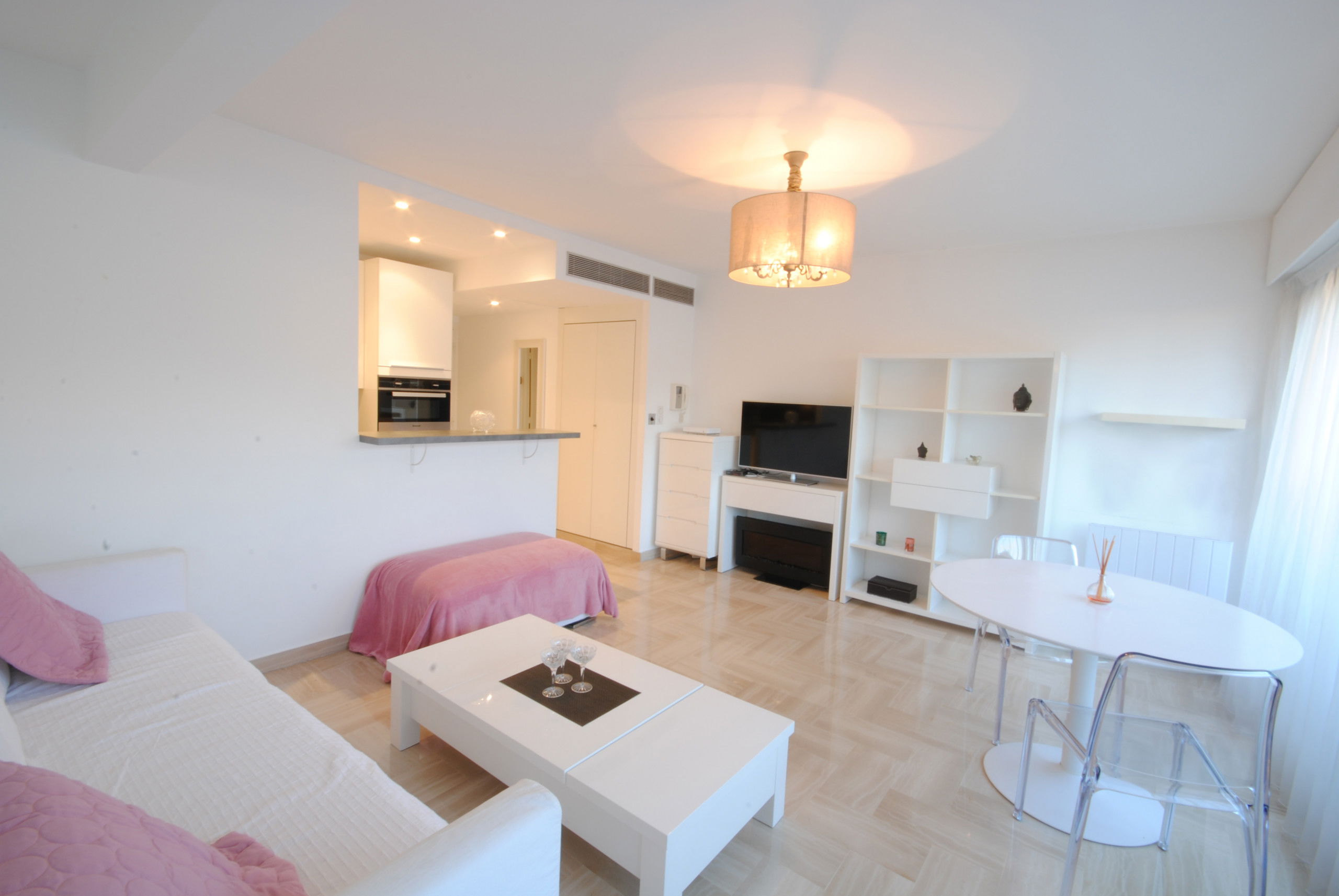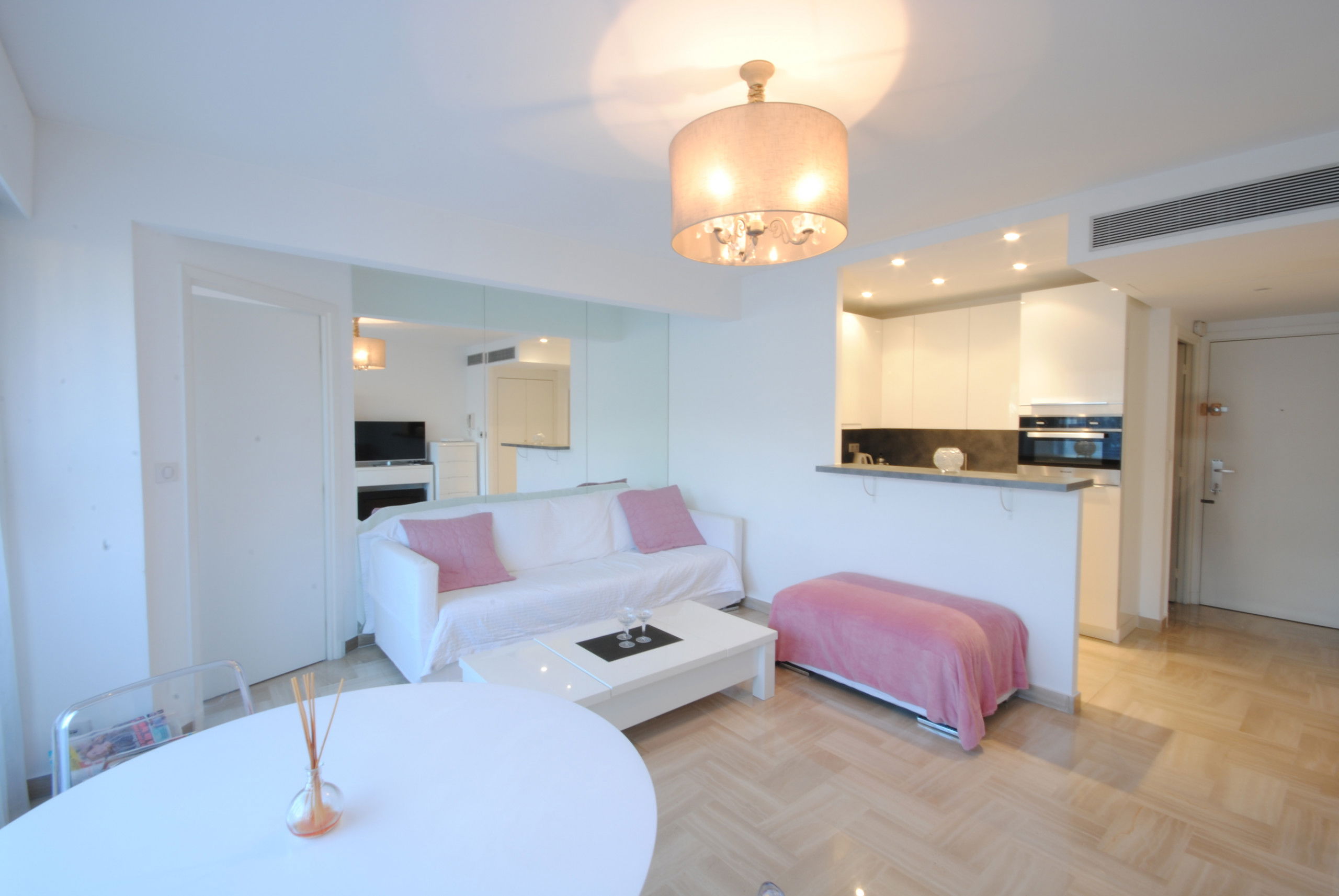 2 rooms of approximately 50m², terrace, on the 6th floor with lift at the Gray d'Albion residence . Bedroom with double bed 160x200, en-suite bathroom with washbasin, bath, toilet, hairdryer. Living room with sofa bed, TV, WIFI . Open kitchen with fridge, combined microwave, electric plate 2 hobs, kettle, toaster, Nespresso coffee machine. Guest toilet. Air conditioning by the building . Beautiful terrace with outdoor furniture. High-end building: security 7/7 - 24/24 Collective hot water, individual electric heating . Payable parking in the basement. 5mn walk from the Palais des Festivals, train station and airport shuttle. Shops, supermarkets and restaurants nearby. 30km from Nice Côte d'Azur airport, 12km from Mandelieu Golf Course