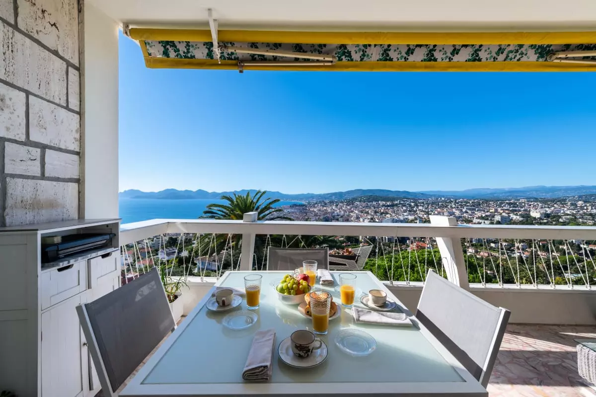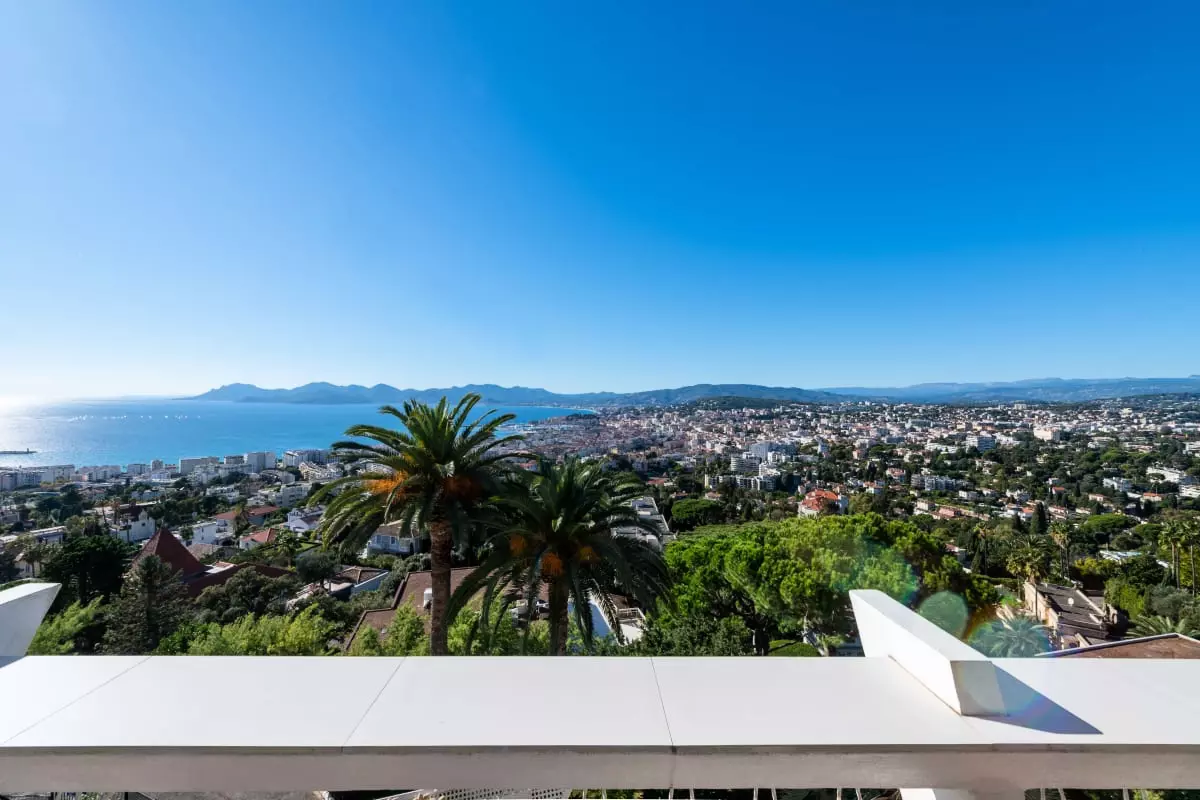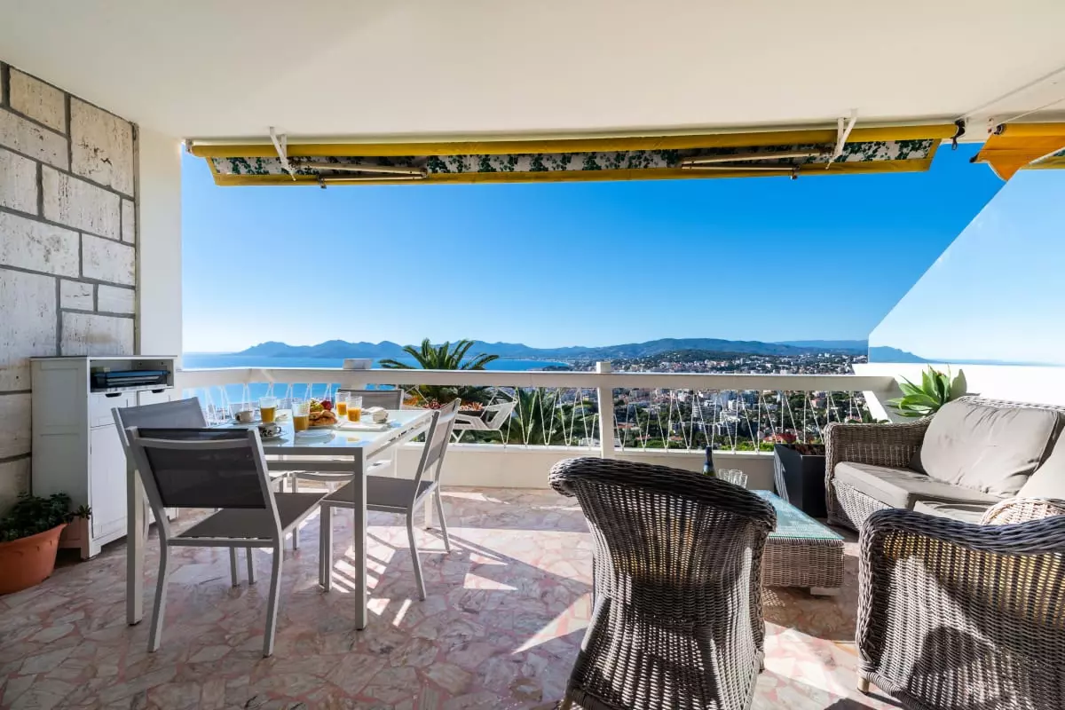 The terrace, the true highlight of the property, offers an exceptional panoramic view: mountains, the city of Cannes, the sea, and islands. It is furnished with a dining table and a lounge area to enjoy every moment.