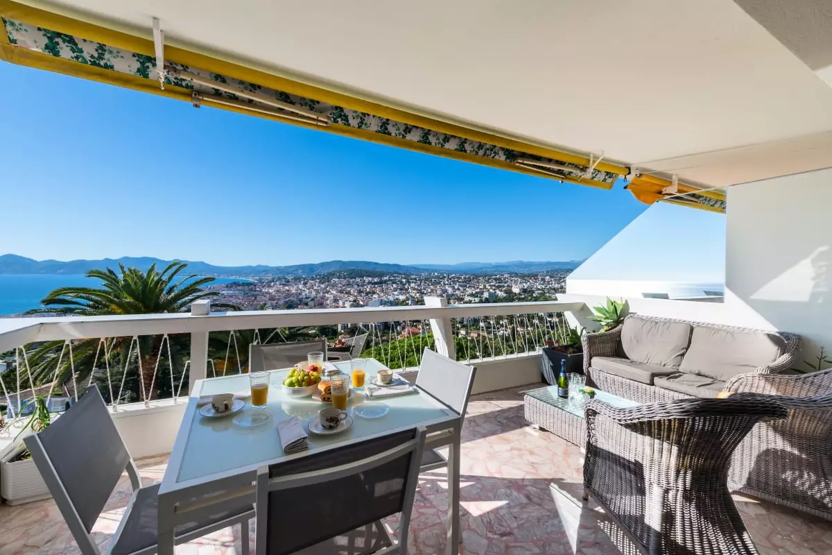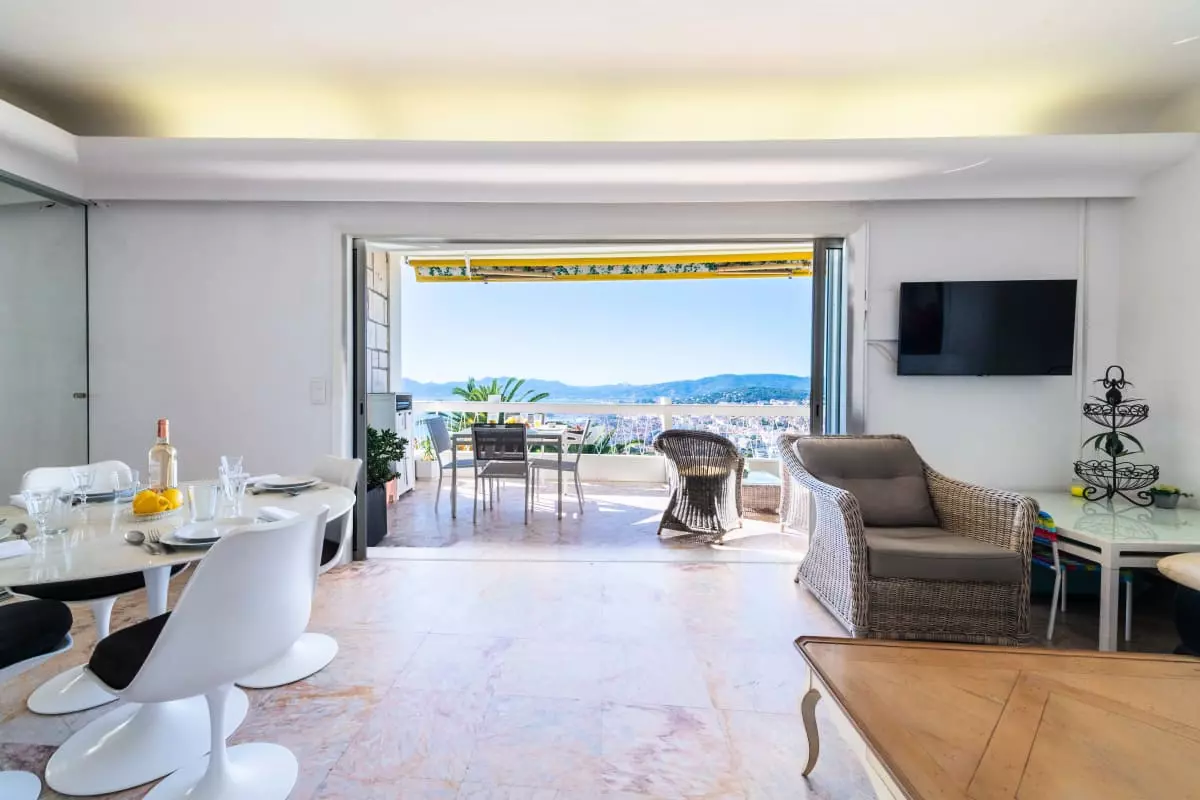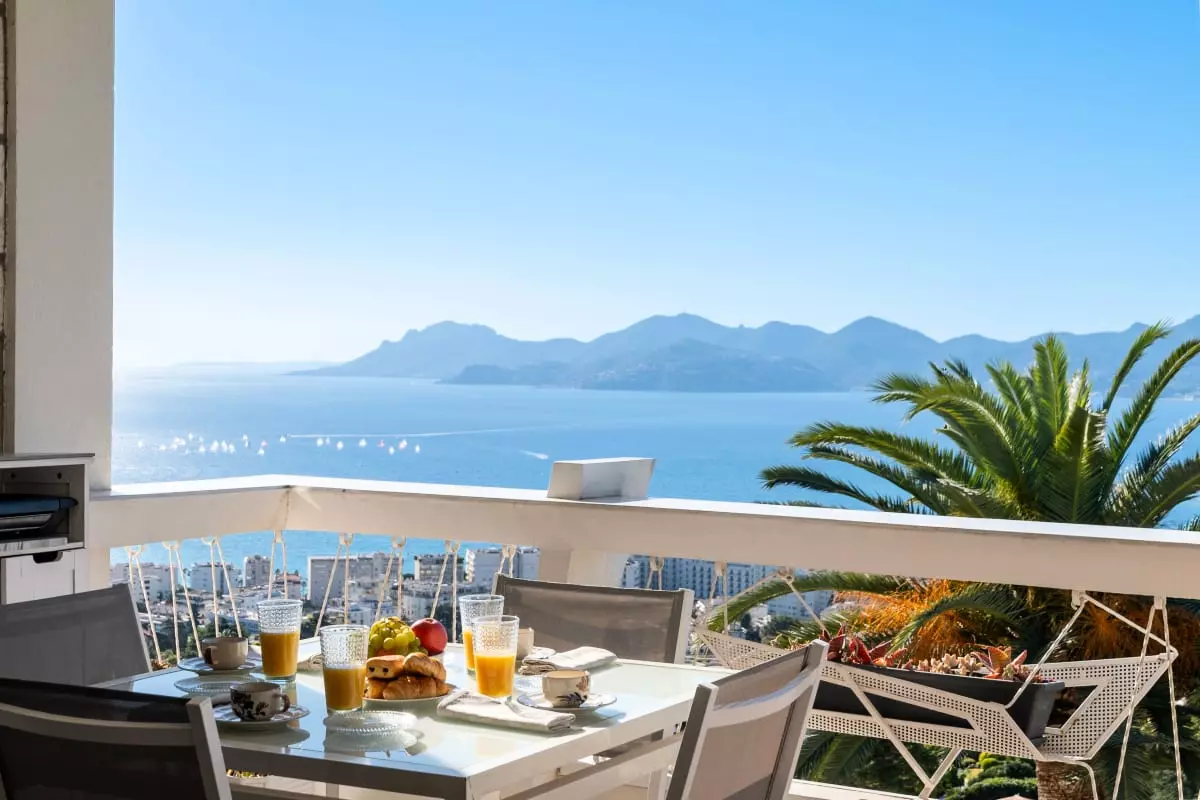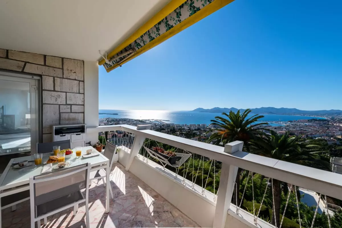 The terrace, the true highlight of the property, offers an exceptional panoramic view: mountains, the city of Cannes, the sea, and islands. It is furnished with a dining table and a lounge area to enjoy every moment.