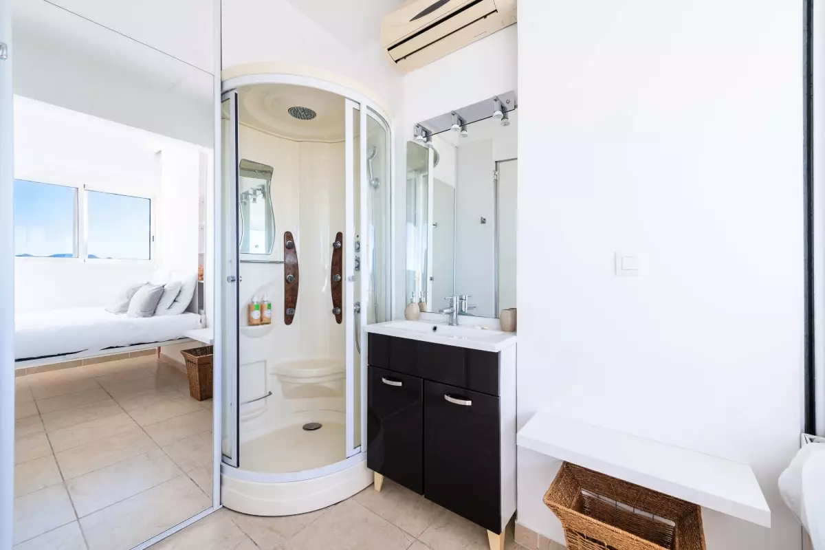 A second bedroom with a double bed (140x200 cm) and its own en-suite shower. The entire suite faces the sea.