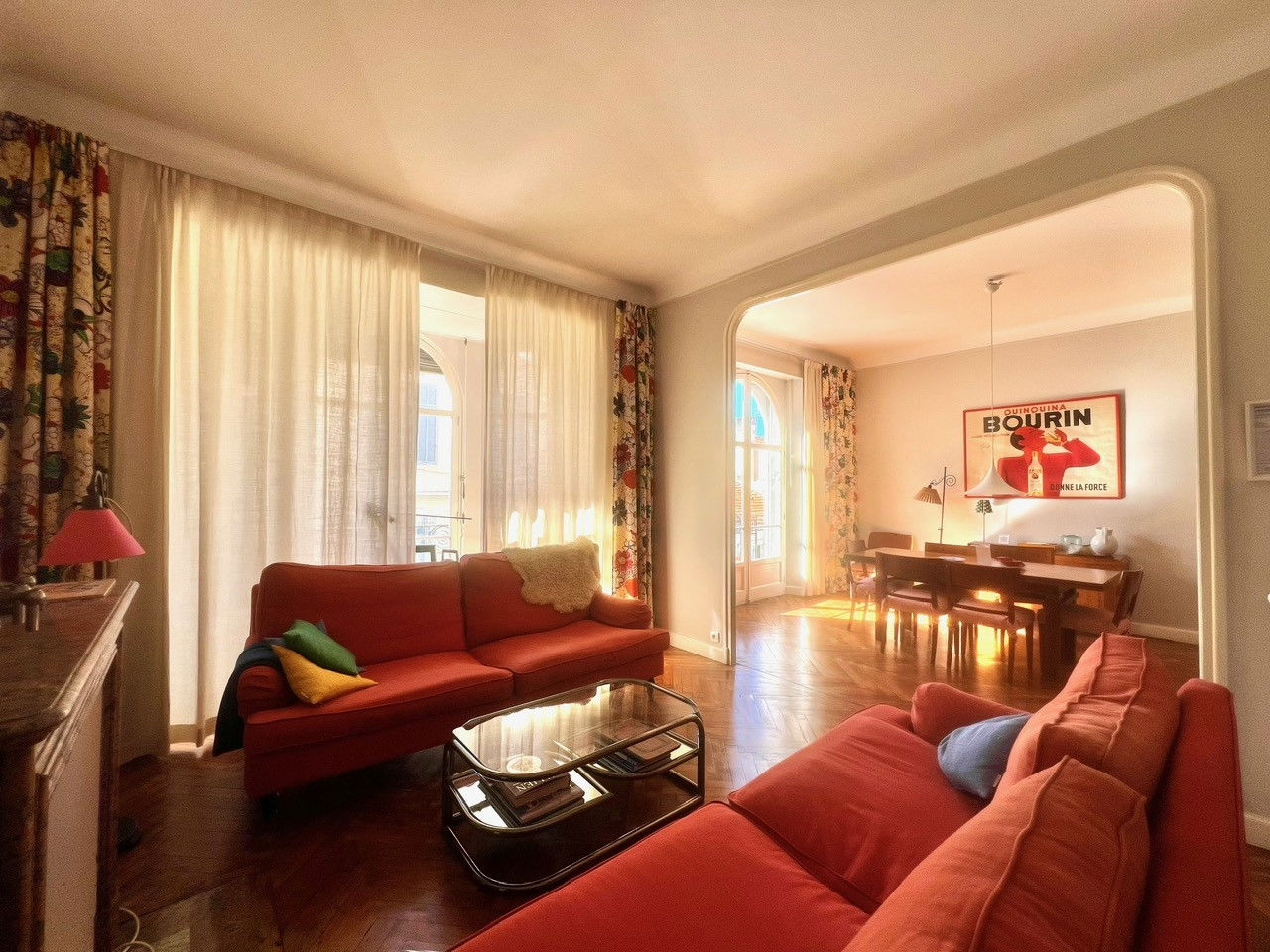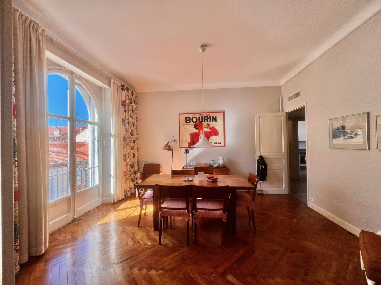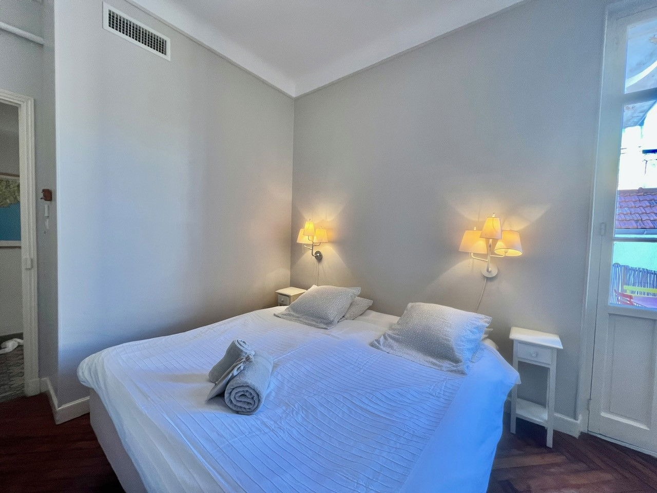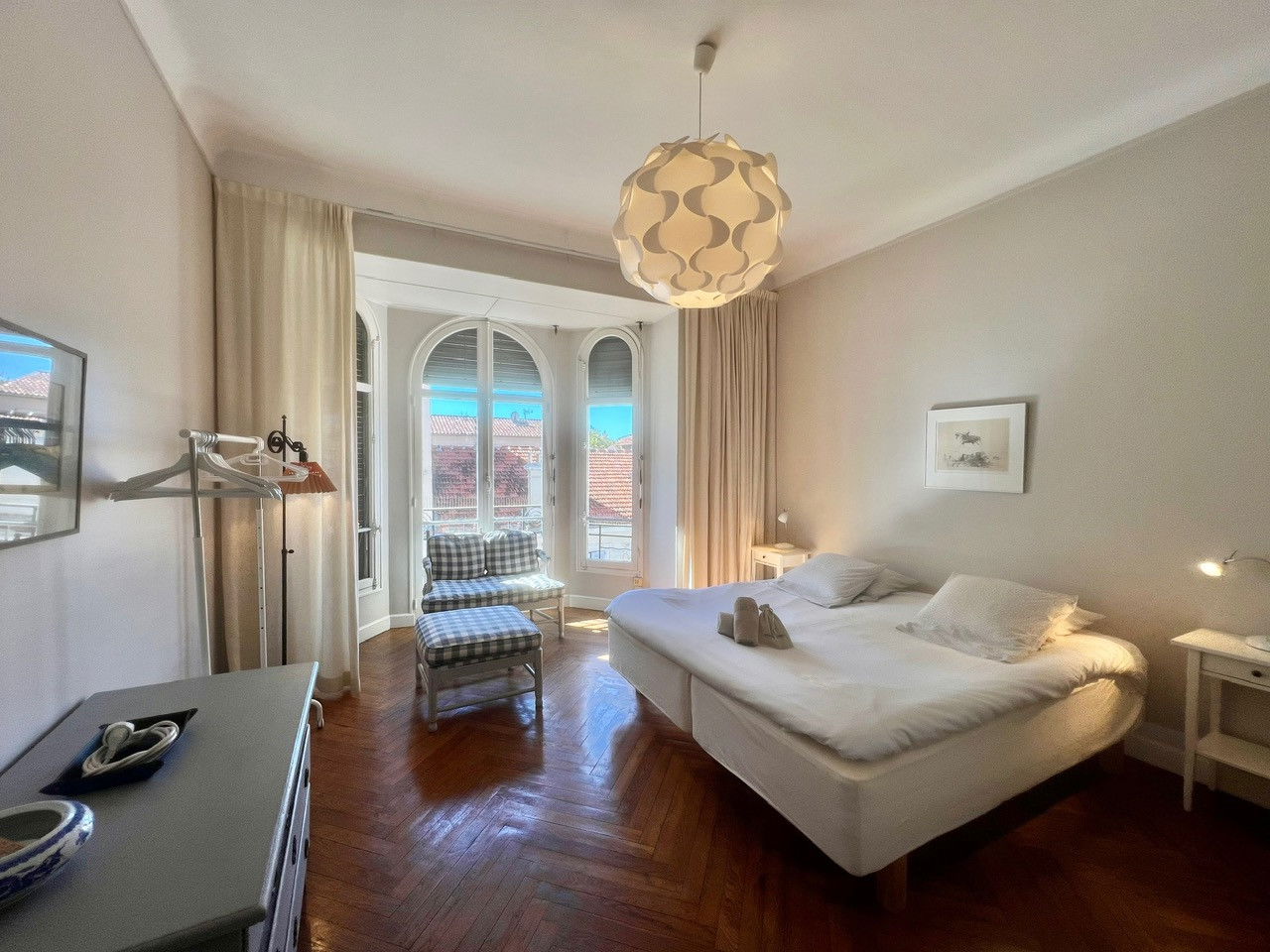 in a town building, 8 minuts walk from the beaches and the Croisette, high floor without elevator, large 3 rooms of 97m2 offers a beautiful double living room with its dining area open on a sunny balcony and a pleasant living room, 2 bedrooms with 2 single beds in each room (possibility to make a big bed)a bathroom, a beautiful kitchen open to a balcony