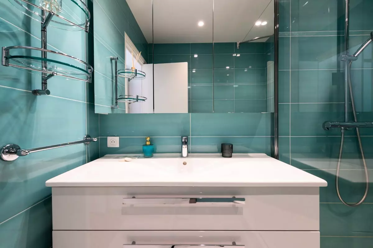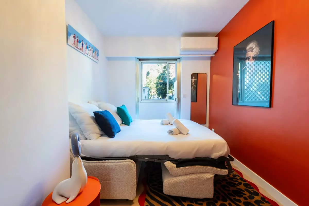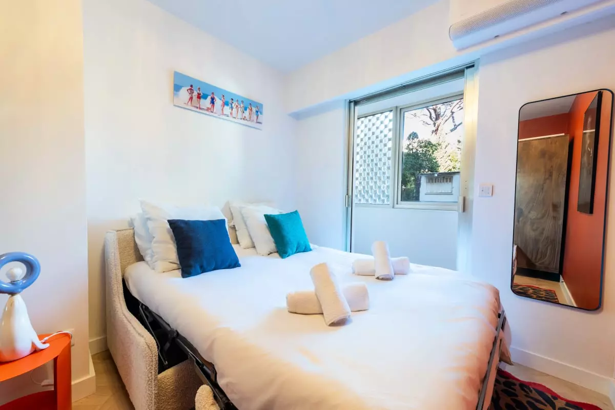 On the other side of the apartment, a second bedroom equipped with a sofa bed (140x190cm) opens onto a north-facing loggia.