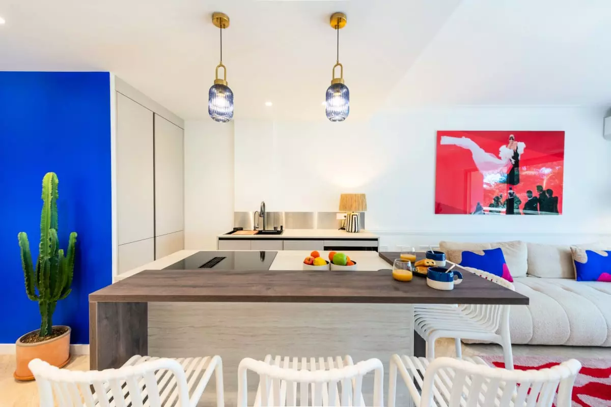 The entrance opens onto a vast south-facing living room, with a lounge area and connected television, from which you will have access to the terrace, ideal for meals or relaxing moments facing the Mediterranean.