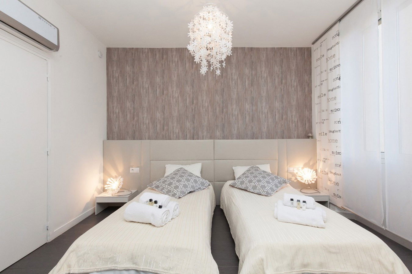The elegantly arranged bedroom offers two twin beds and a spacious en-suite shower room. The separate toilet adds a touch of privacy to the space.