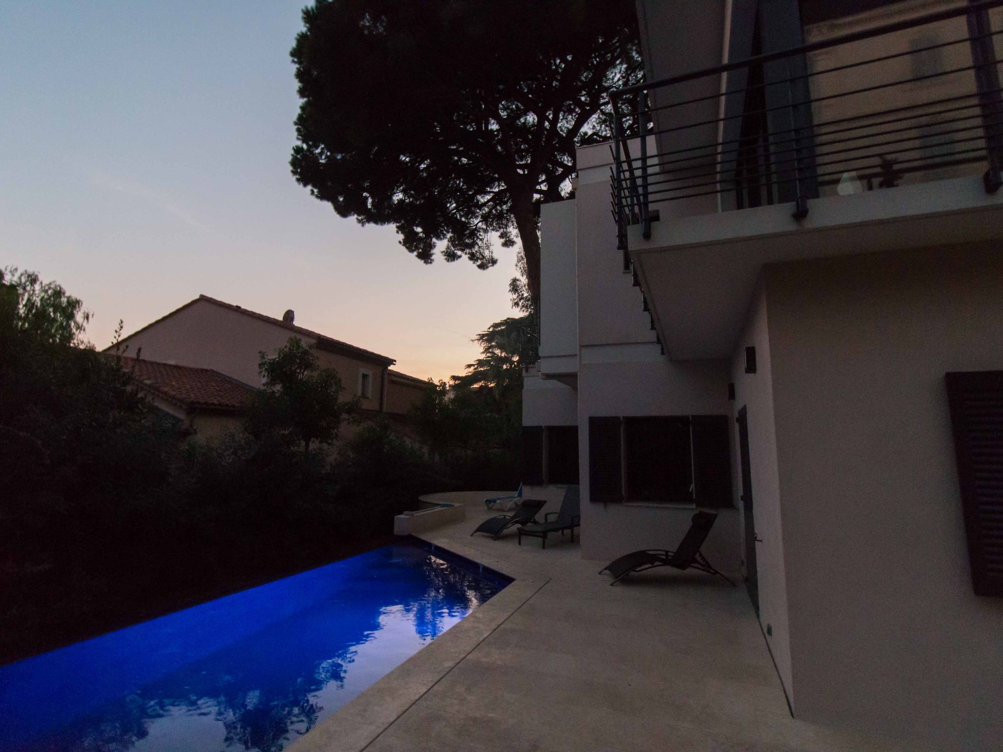 Outside, a large terrace with garden furniture, two balconies and a garden with an infinity swimming pool (heatable) await you. Here you can completely relax and unwind. The infinity pool is a saltwater pool, i.e. it is very pleasant, odourless and equipped with the latest water treatment technology without the addition of chlorine. Another highlight is the private boules court (boccia). The garden is shared with the owner at times or, after completion of the garden flat, with its tenants if rented at the same time. You can actively explore the neighbourhood with the four bicycles available (three men's bikes, one women's bike). Cars can be parked free of charge in three private outdoor car parks. Pets are allowed on request.