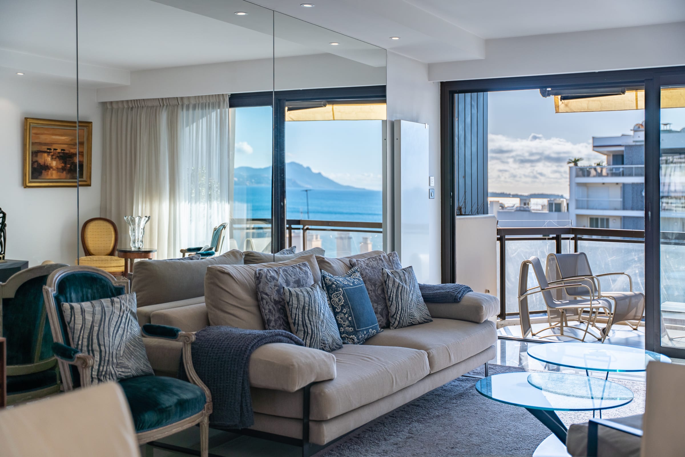 - The south-facing terrace, furnished with outdoor seating, offers a spectacular sea view with the Carlton Hotel as a landmark — perfect for sunny breakfasts or evening drinks.