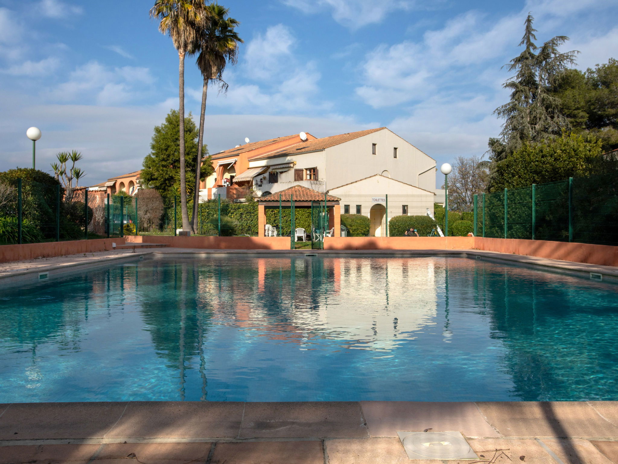 Residence "La Calmeraie". In the district of Les Maurettes, 1 km from the sea, 1 km from the beach. For shared use: swimming pool angular fenced (seasonal availability: 01.Jun. - 30.Sep.). In the complex: lift. Supermarket 1 km, restaurant 220 m, bar 150 m, bakery 1 km, bus stop "les cavaliers" 400 m, railway station "Gare Vileneuve-Loubet Plage" 900 m, shingle beach "publique" 1 km. Sports harbour 1.5 km, marina 1.5 km, golf course (18 hole) 4.5 km, sailing school 1.5 km, cycle lane 1.2 km. Nearby attractions: centre nautique, location de jet ski 2.6 km, Musée Picasso Antibes 7 km, Juan les Pins 9 km, Saint Paul de Vence 12 km, Hippodrome Cagnes sur mer 5 km, Nice 16 km. Well-known lakes can easily be reached: Lac Saint Cassien 50 km. Hiking paths: Parc National du Merantour 70 km. Residence with electric gates. Only the wearing of swimsuits is authorized in the swimming pool of the residence.