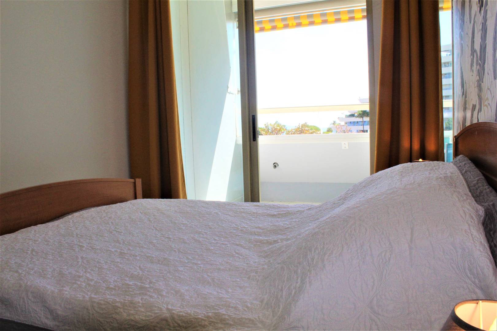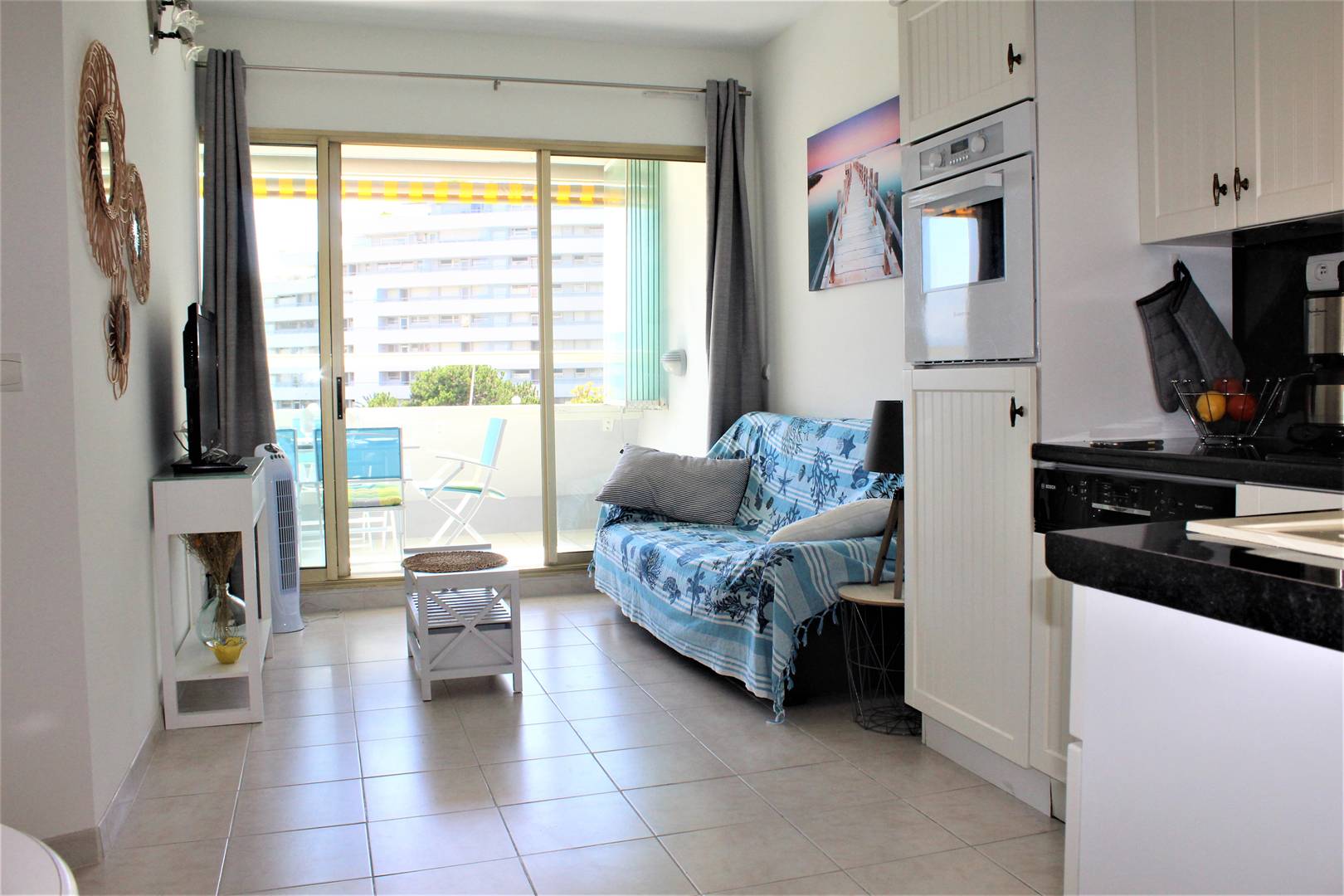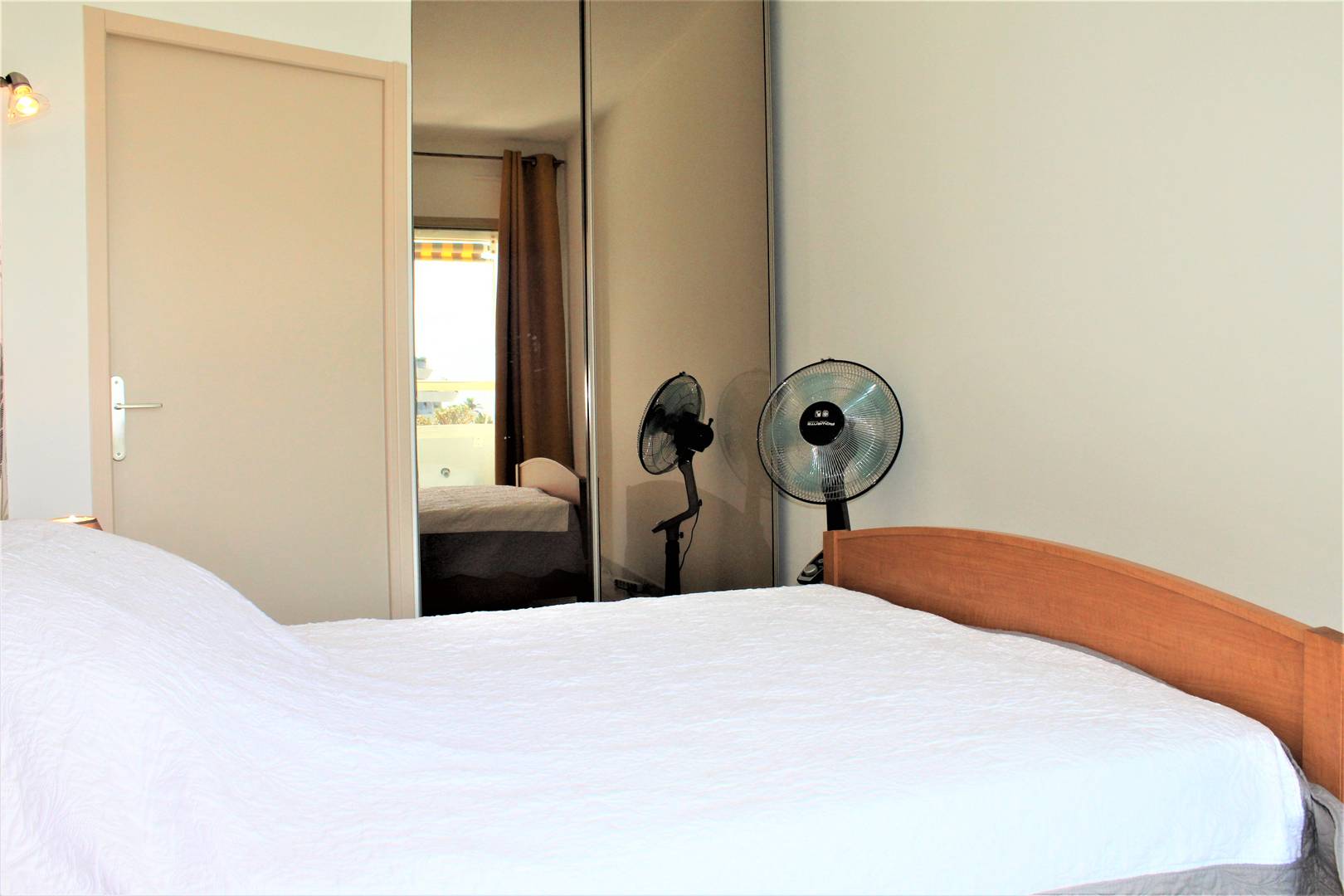 Villeneuve Loubet Plage (06) Le Baronnet Port Marina Baie des Anges Beautiful 3-room apartment of 42m², sleeps 4/5 Apartment located in the Residence Le Baronnet at the foot of a marina with all amenities. Beautiful apartment located on the 5th floor, It is composed at the entrance of a small bedroom on the passageway side with a sofa bed sleeping 140 cm. A second bedroom with a double bed sleeping 140 cm, storage, opening onto the terrace. A shower room with separate toilet. A fully equipped contemporary kitchen (dishwasher, oven, fridge) open to the living-dining room, with television, convertible sofa bed 140 cm opening onto a large terrace with sea view and gardens. This apartment has a private closed box in the residence. End of stay cleaning included. Household linen is not provided. The advantage of this accommodation: This contemporary apartment offers a view and a convivial space thanks to the terrace.