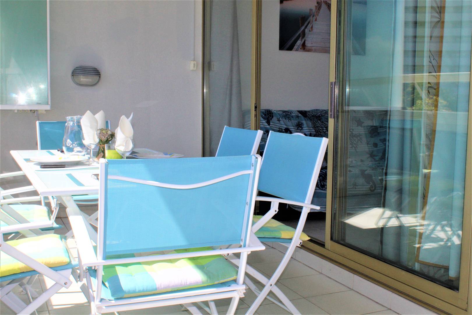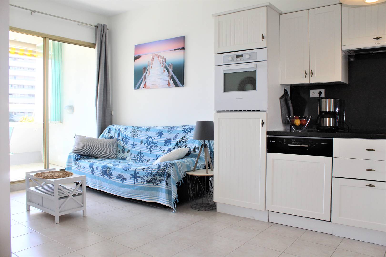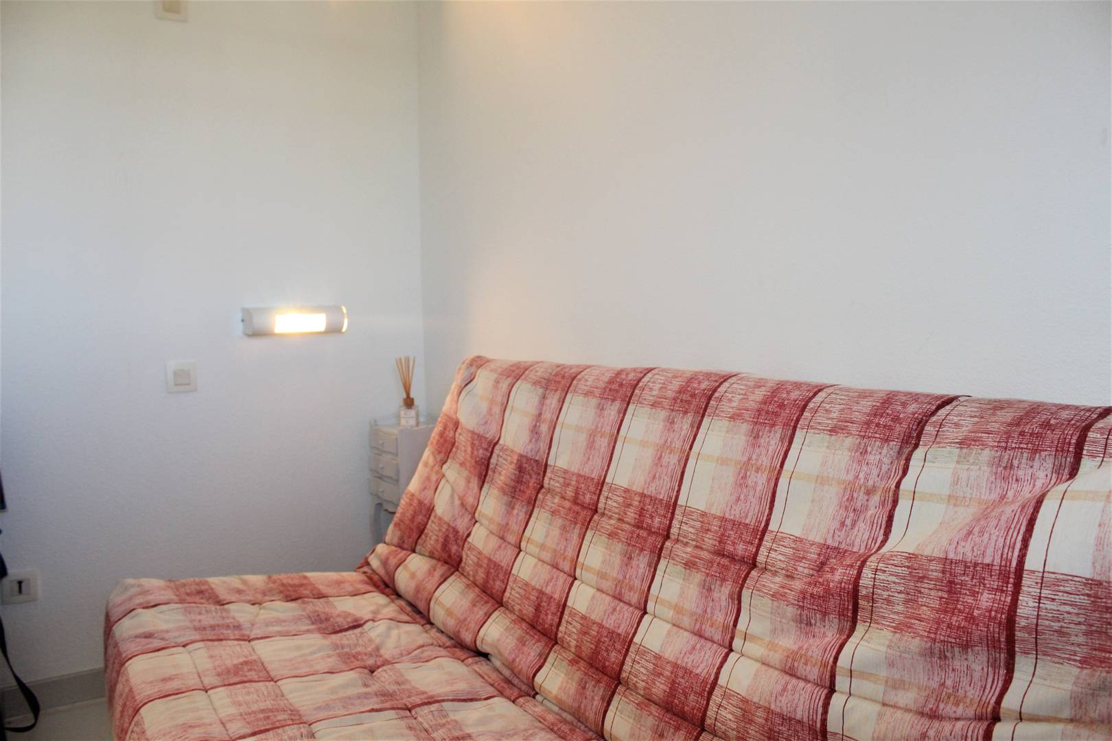 Villeneuve Loubet Plage (06) Le Baronnet Port Marina Baie des Anges Beautiful 3-room apartment of 42m², sleeps 4/5 Apartment located in the Residence Le Baronnet at the foot of a marina with all amenities. Beautiful apartment located on the 5th floor, It is composed at the entrance of a small bedroom on the passageway side with a sofa bed sleeping 140 cm. A second bedroom with a double bed sleeping 140 cm, storage, opening onto the terrace. A shower room with separate toilet. A fully equipped contemporary kitchen (dishwasher, oven, fridge) open to the living-dining room, with television, convertible sofa bed 140 cm opening onto a large terrace with sea view and gardens. This apartment has a private closed box in the residence. End of stay cleaning included. Household linen is not provided. The advantage of this accommodation: This contemporary apartment offers a view and a convivial space thanks to the terrace.