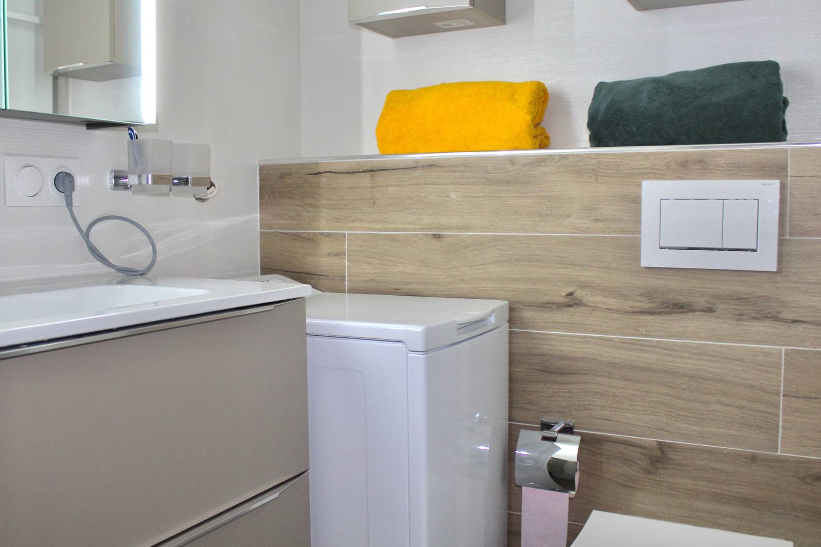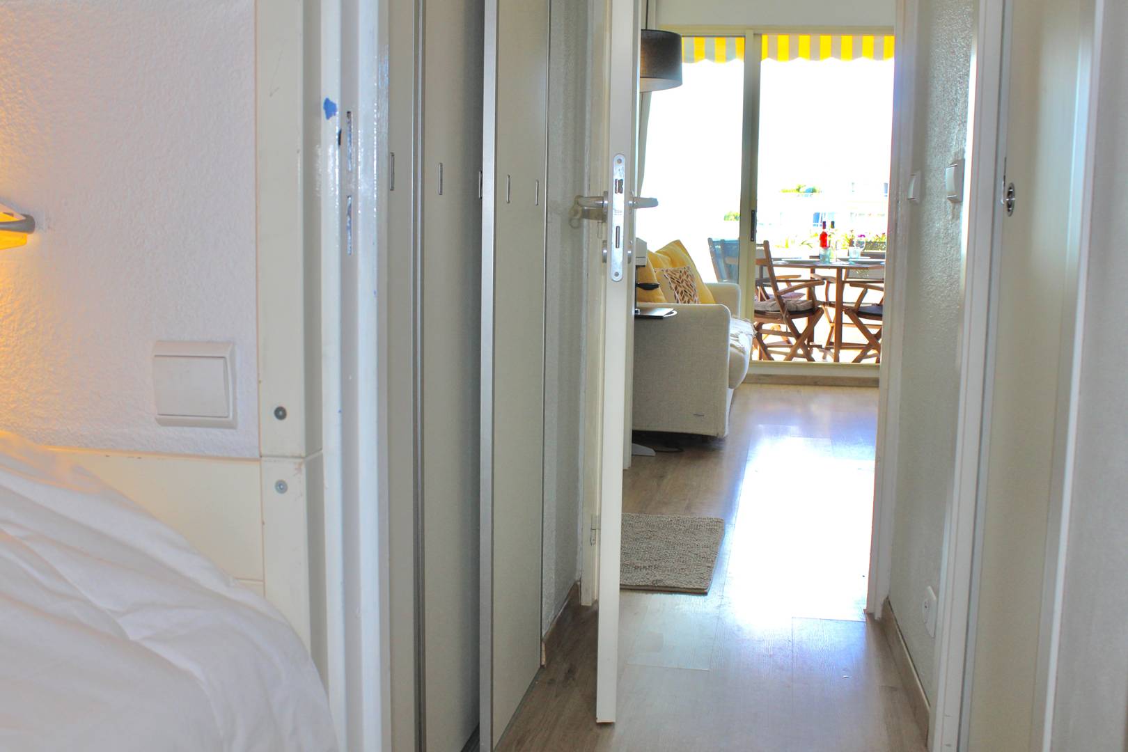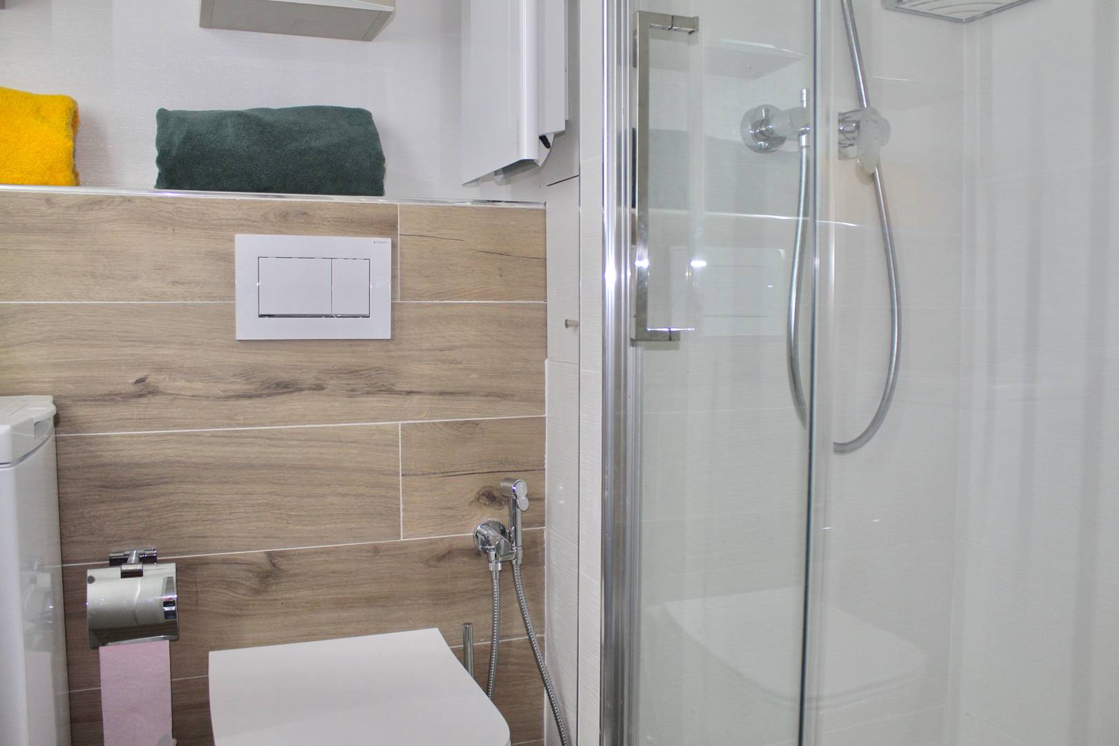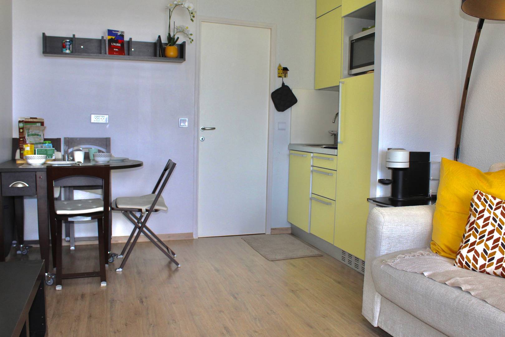 This very beautiful holiday apartment on the 11th floor with air conditioning and parking is composed at the entrance of a small bedroom with two bunk beds (80 x 190 cm), a bathroom with shower and toilet. In the main room you have a fitted kitchen with fridge, microwave, etc. A dining area, television, Wifi, two-person convertible sofa opening onto a very pretty furnished terrace with an exceptional view of the Bay of Angels.