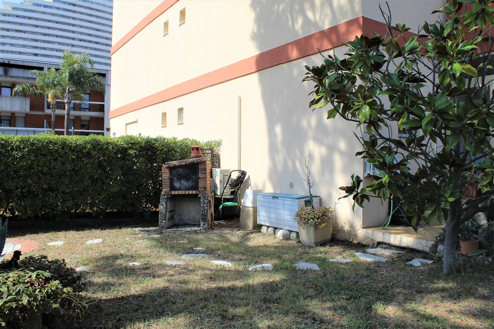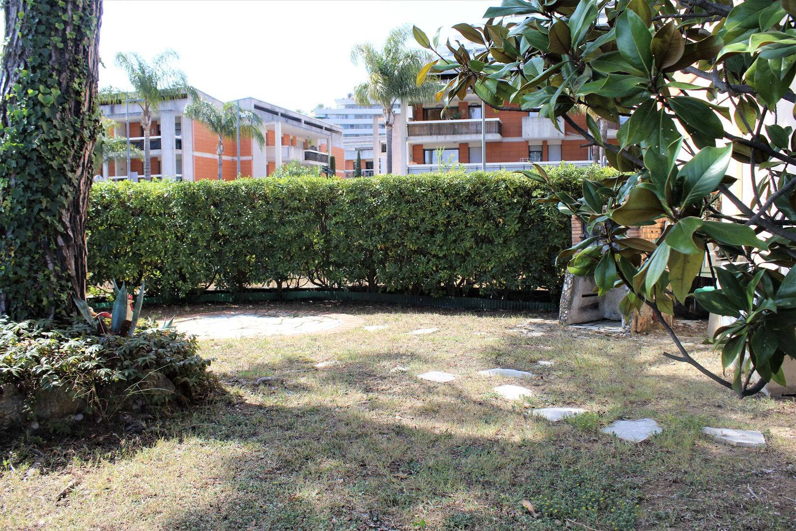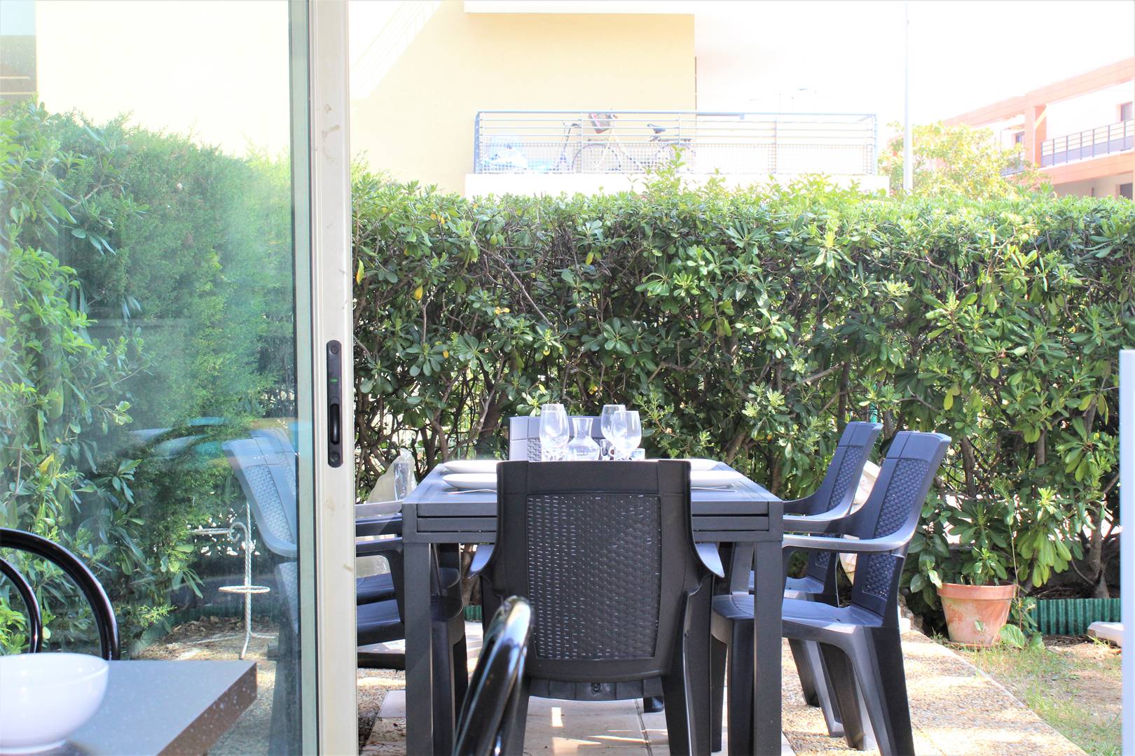 This charming apartment is located on the ground floor, it consists of a small independent kitchen, a very large living room with two sofas convertible into 140 cm beds, its dining area in the terrace closed as a veranda overlooking a huge garden of 80 m² flowered. A shower room and a separate toilet. The accommodation is air-conditioned and has private parking. End of stay cleaning included.