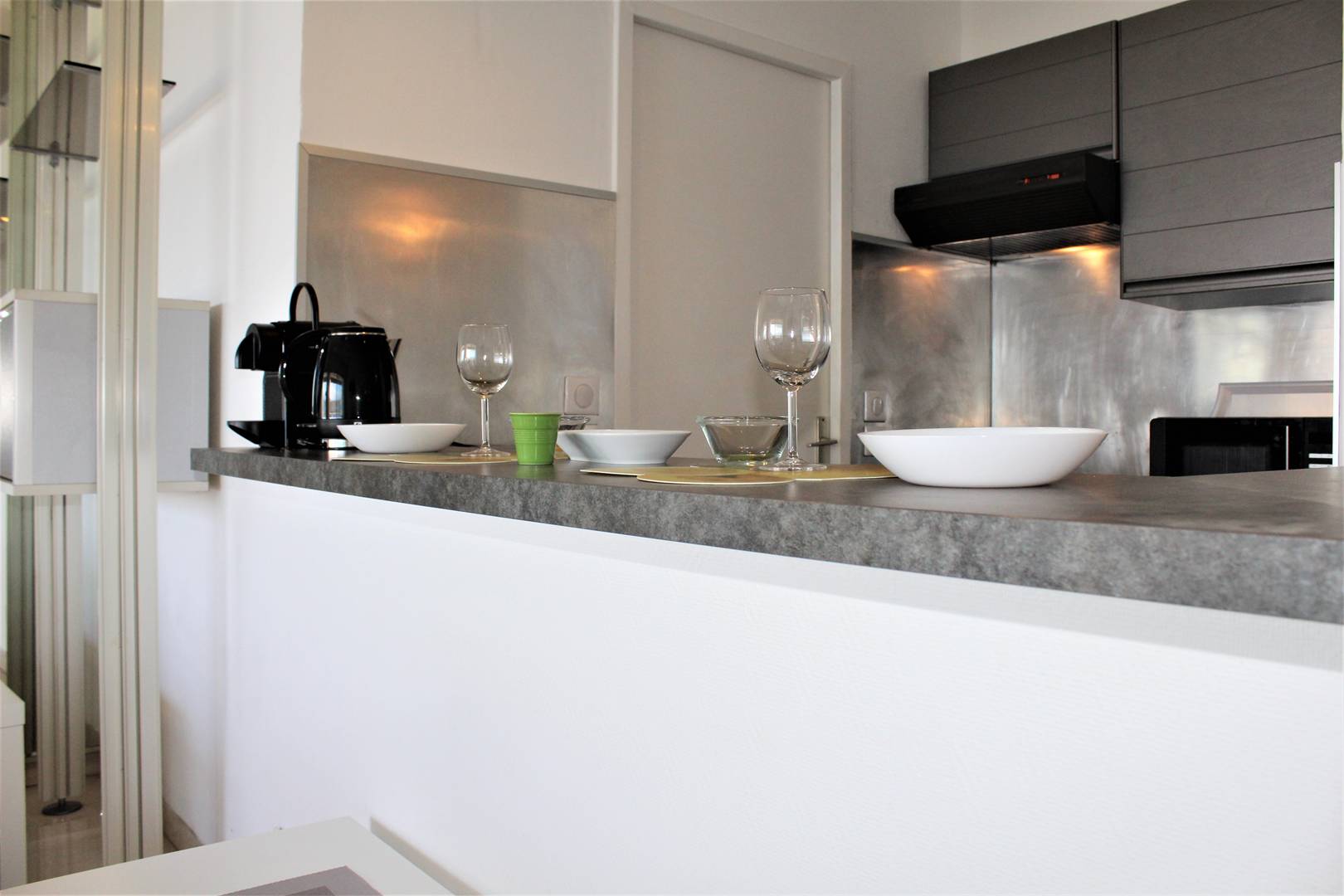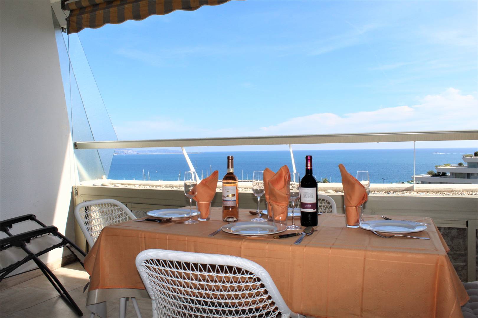The apartment is located on the seventh floor, the living room is composed of a 140 cm sofa bed, a coffee table, a television + WIFI, a dining table that can accommodate up to 4 people opening onto a panoramic sea view terrace. of Nice with a table that can accommodate 4 people. A fully equipped American kitchen, top refrigerator, washing machine, microwave, toaster, coffee maker, kettle. On the corridor side, a bedroom with a 140 cm bed and a shower room, with sink, toilet and washing machine.