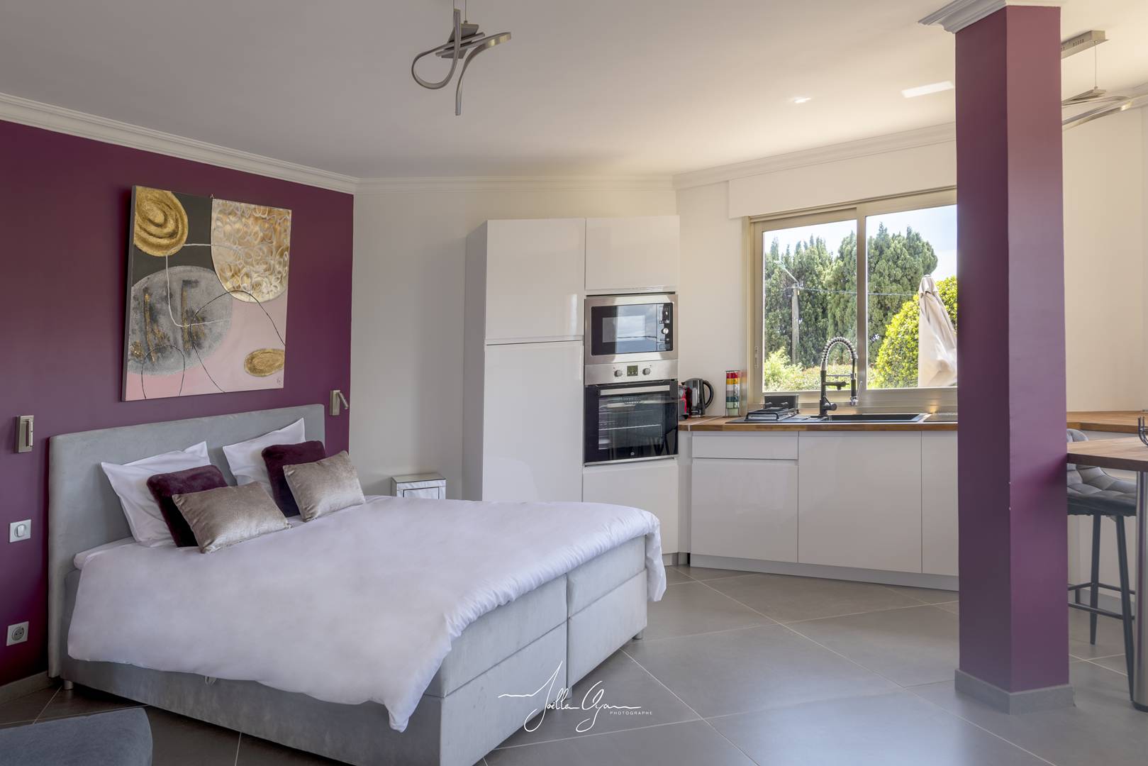 1 large studio with double bed 160x200 and BZ bed 120x190 with open kitchen, dining area, shower room and WC covered terrace and garden