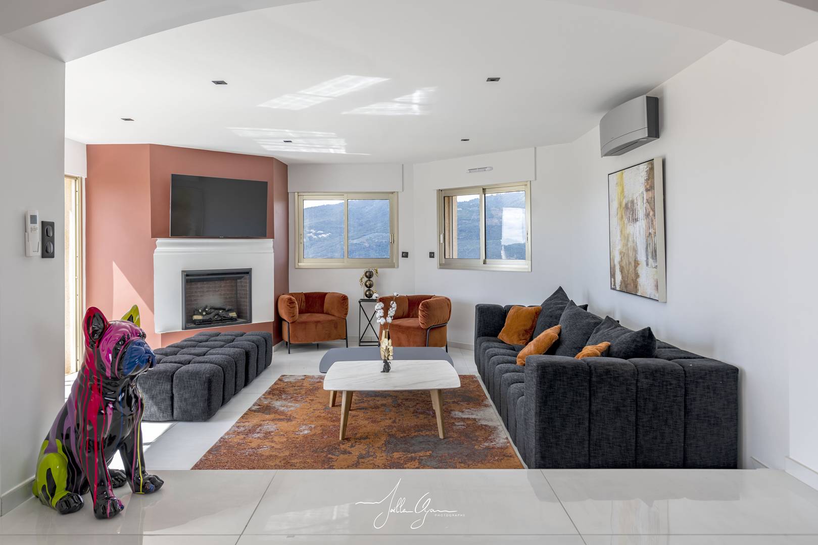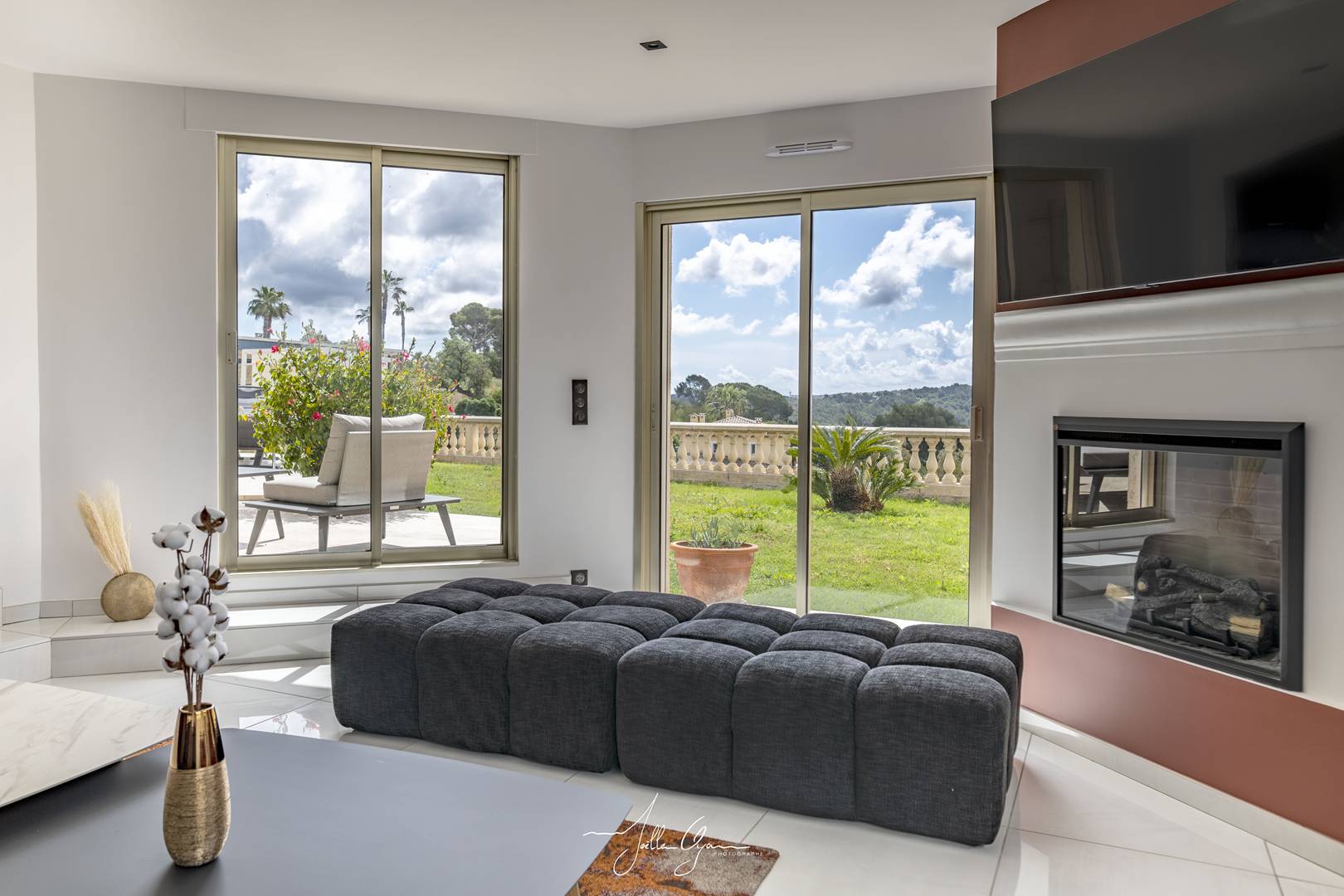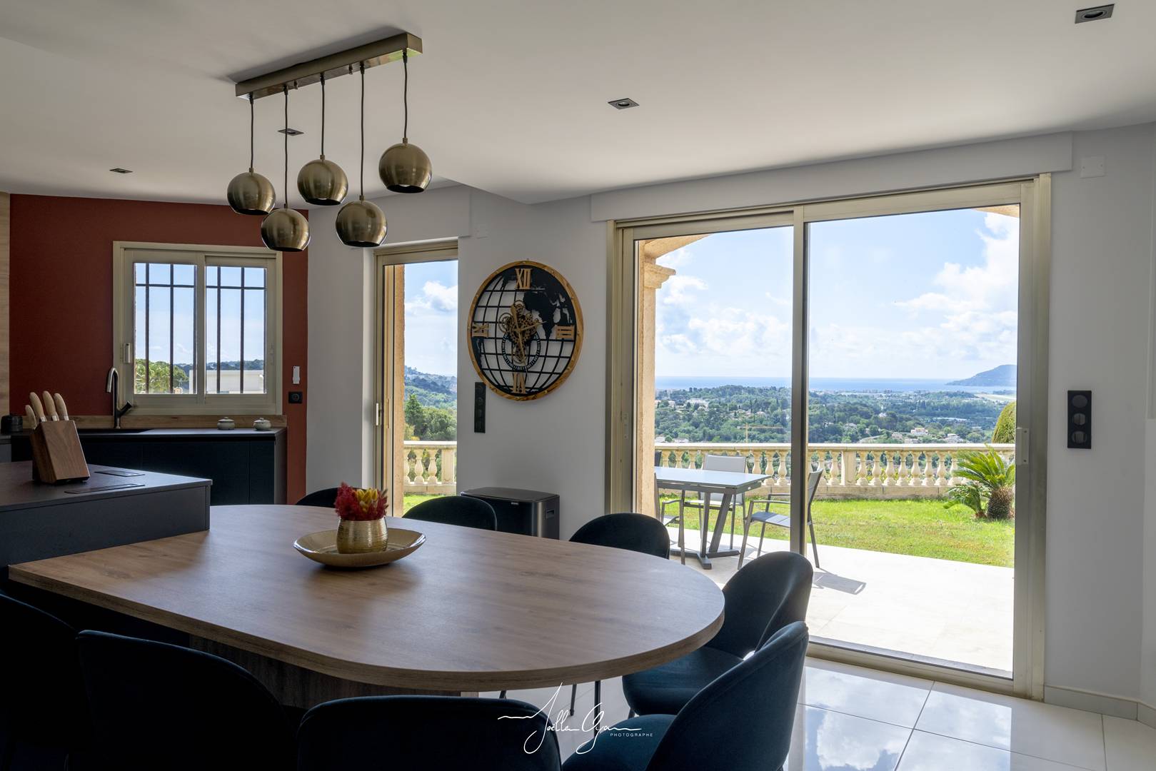 85 m² of living space: Living room with fireplace, dining room/equipped kitchen with storeroom opening onto a superb terrace/lawn with a panoramic sea and mountain view: Bay of Cannes.