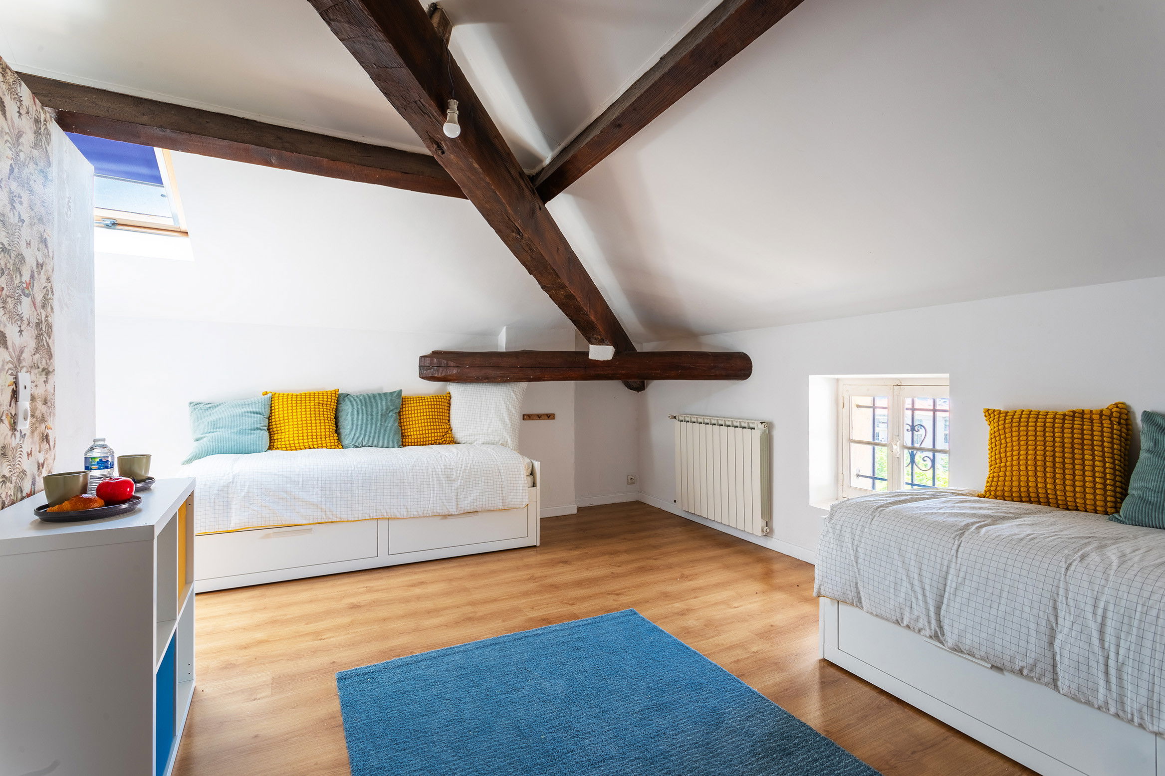 Our spacious 83 m² house can accommodate up to 6 people. It features two comfortable bedrooms: a master bedroom with a double bed and modern decor, and a second bedroom with two single beds, ideal for children or friends. The bright living room has a large sofa, a TV, and contemporary decor, providing an ideal space to unwind after a busy day.