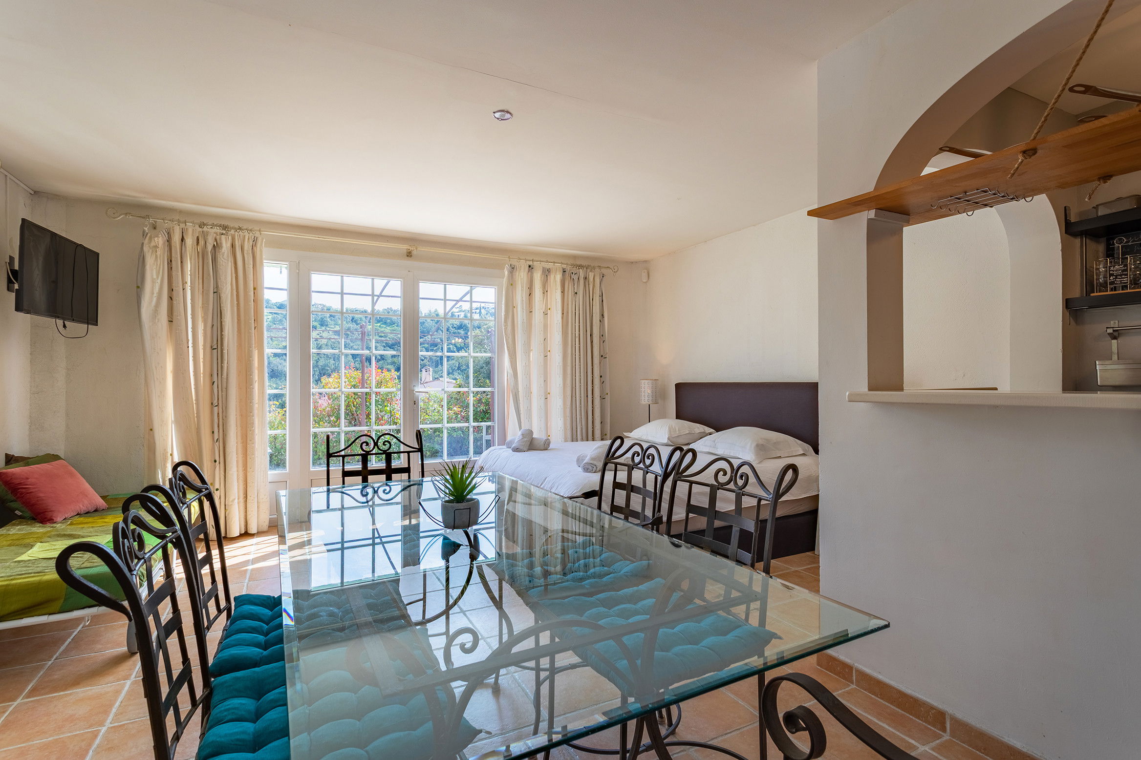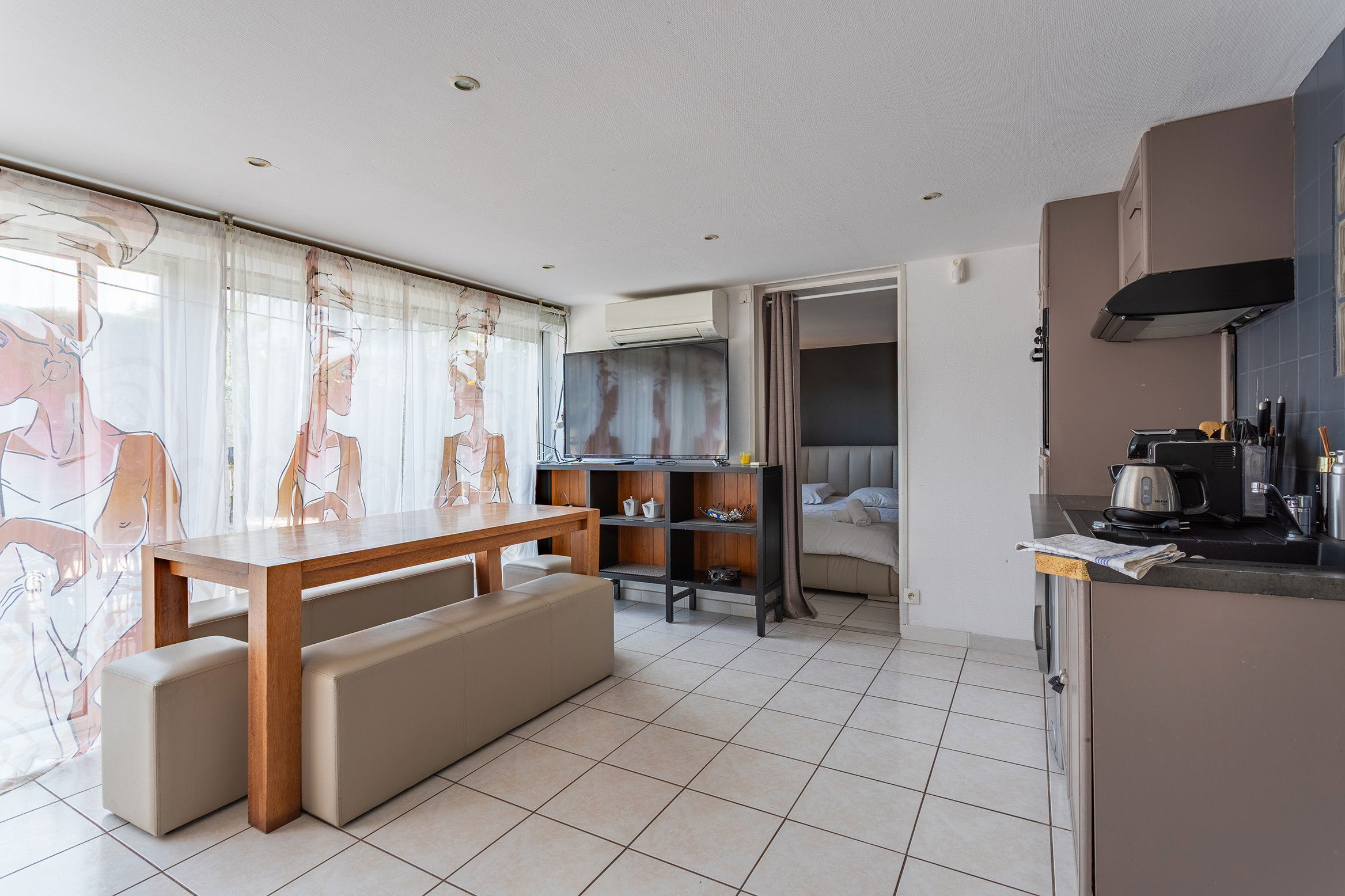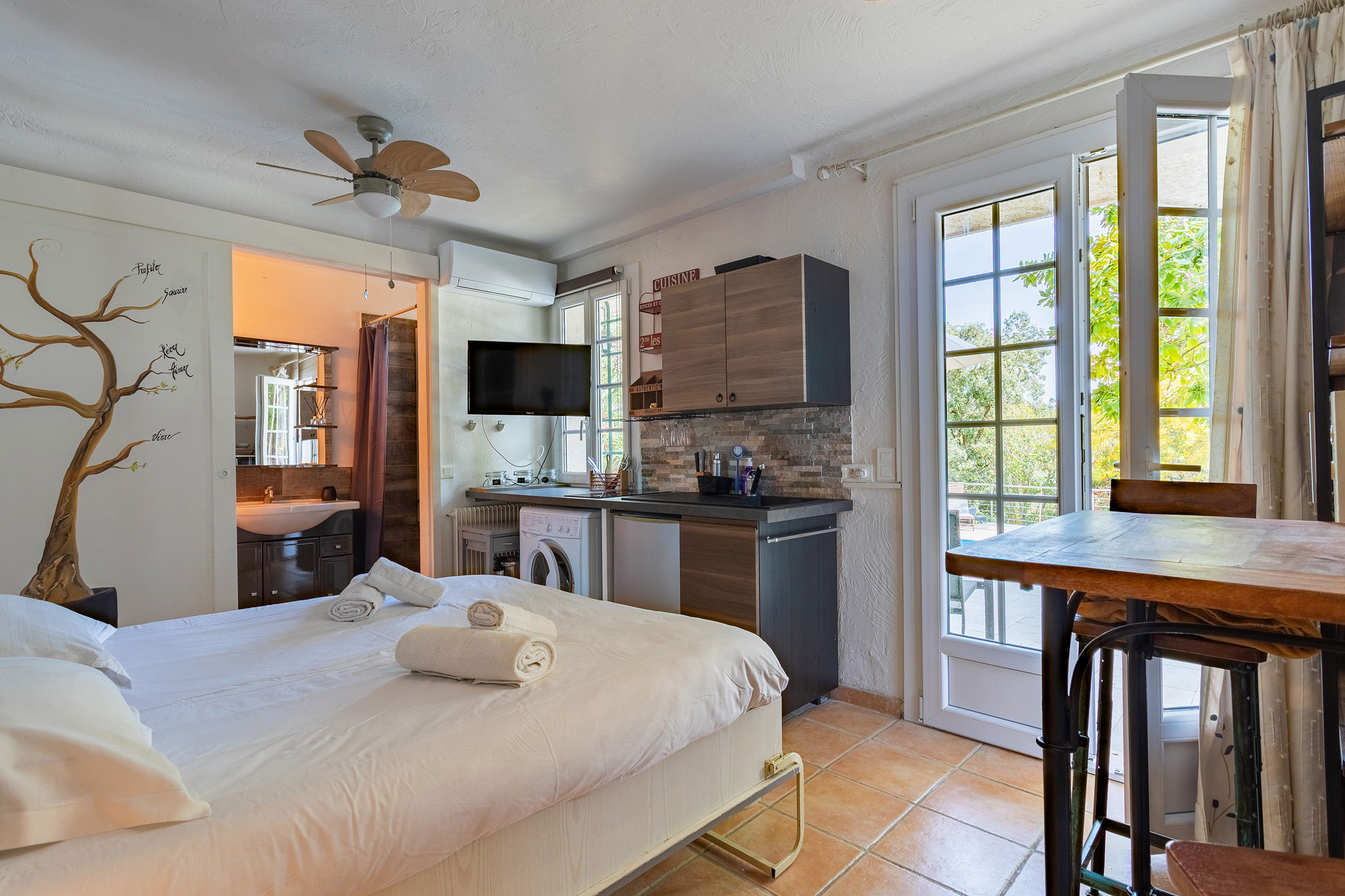 On the garden level, 5 apartments equipped either in studio or in 2 rooms each sleeping 2 people and a bathroom with wc in each, a large terrace along the property.