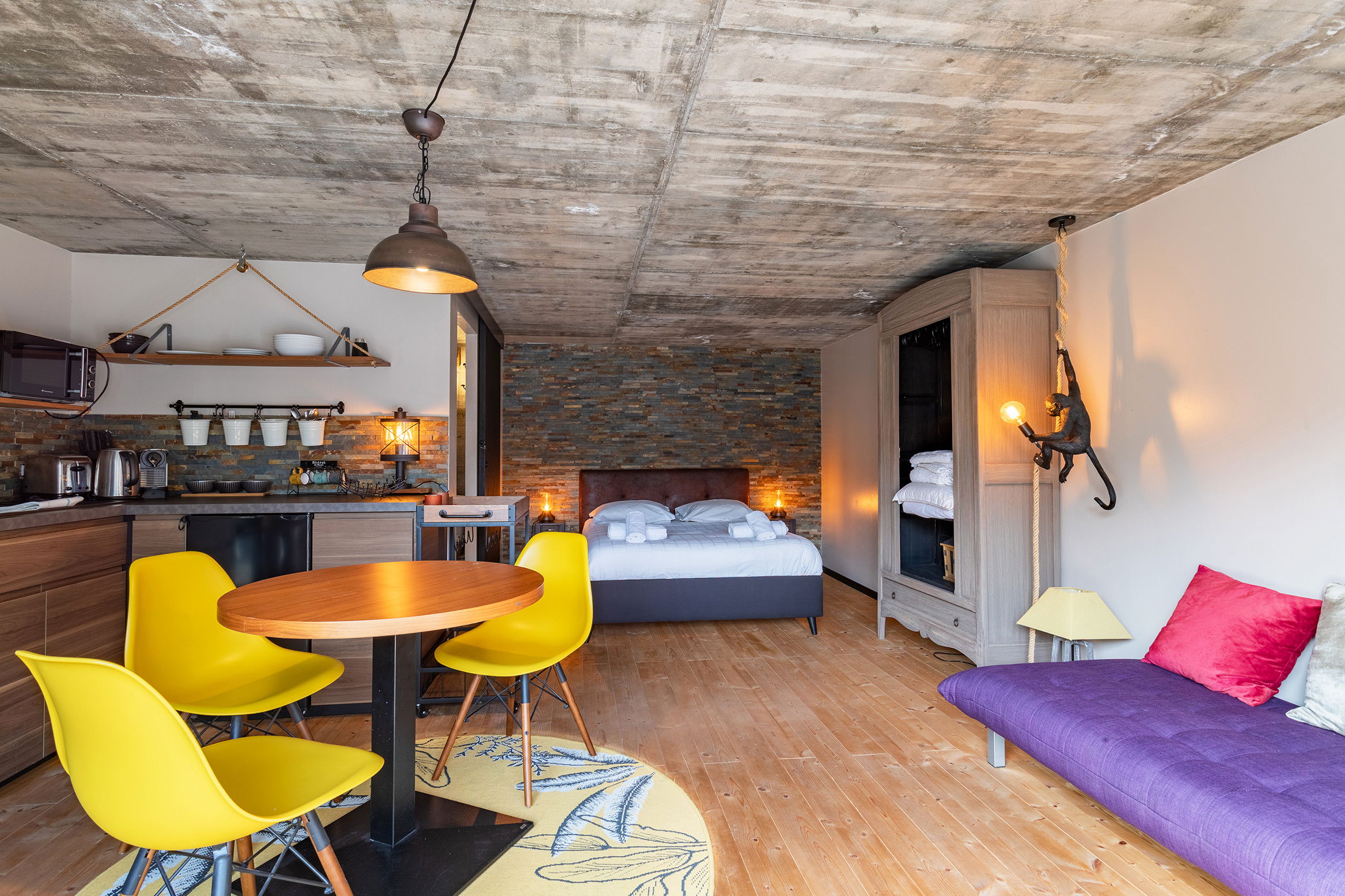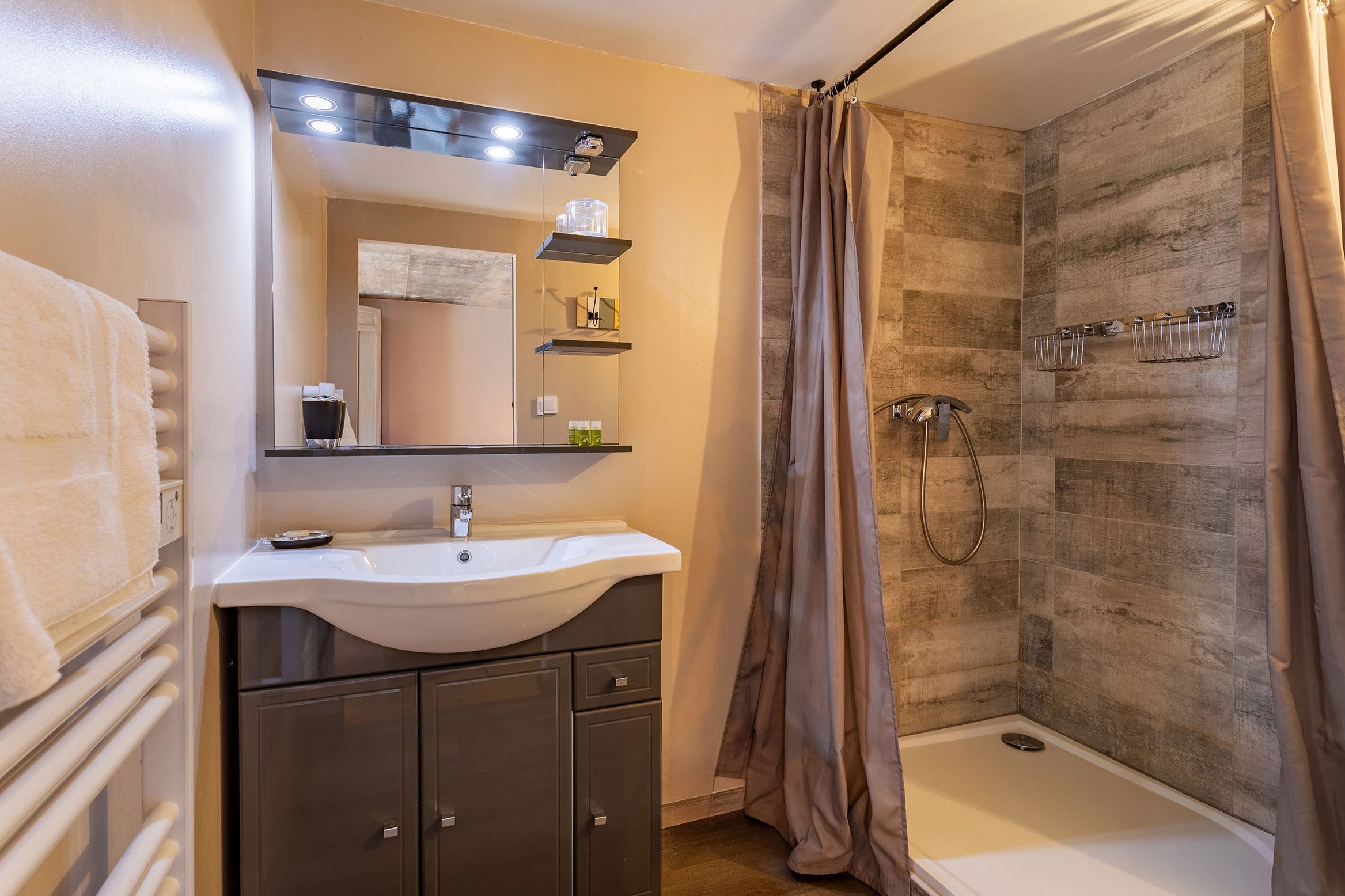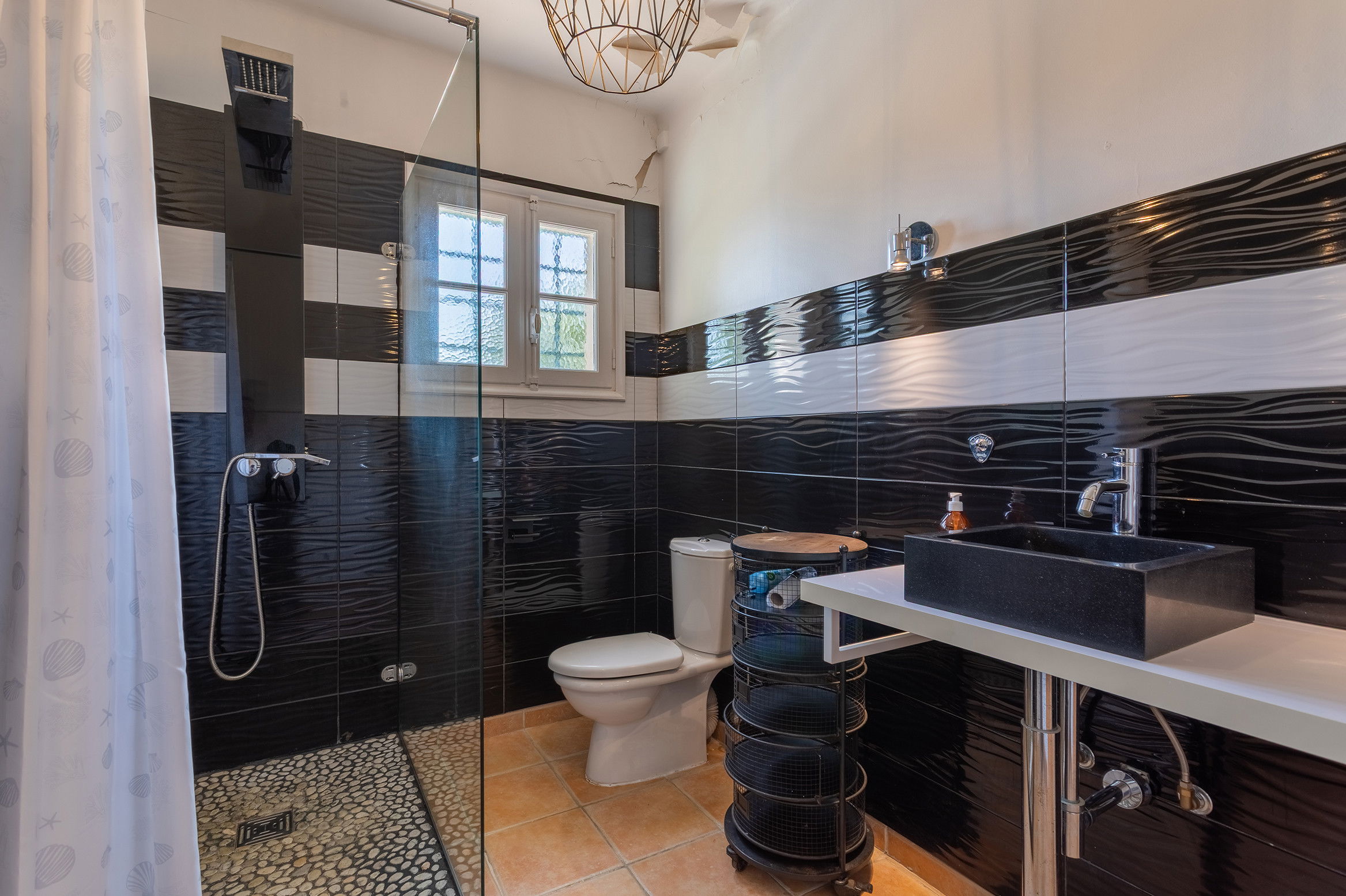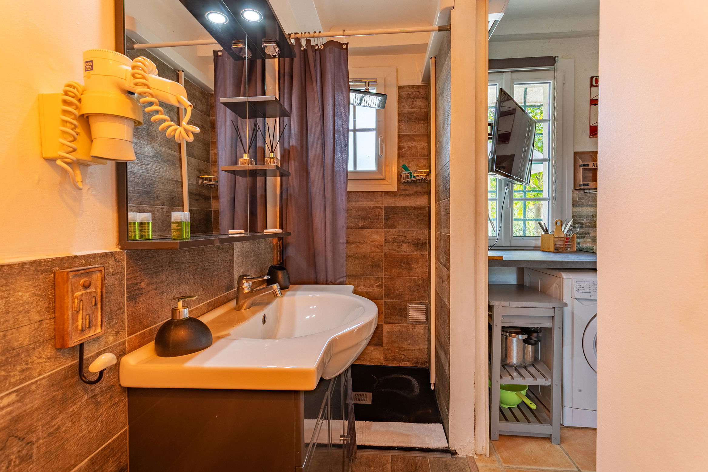 On the garden level, 5 apartments equipped either in studio or in 2 rooms each sleeping 2 people and a bathroom with wc in each, a large terrace along the property.