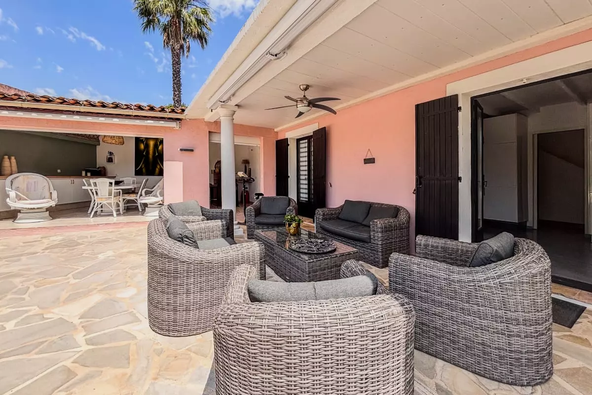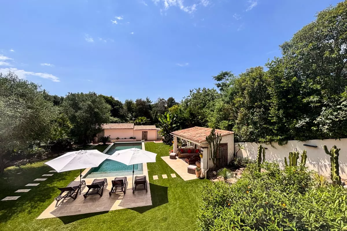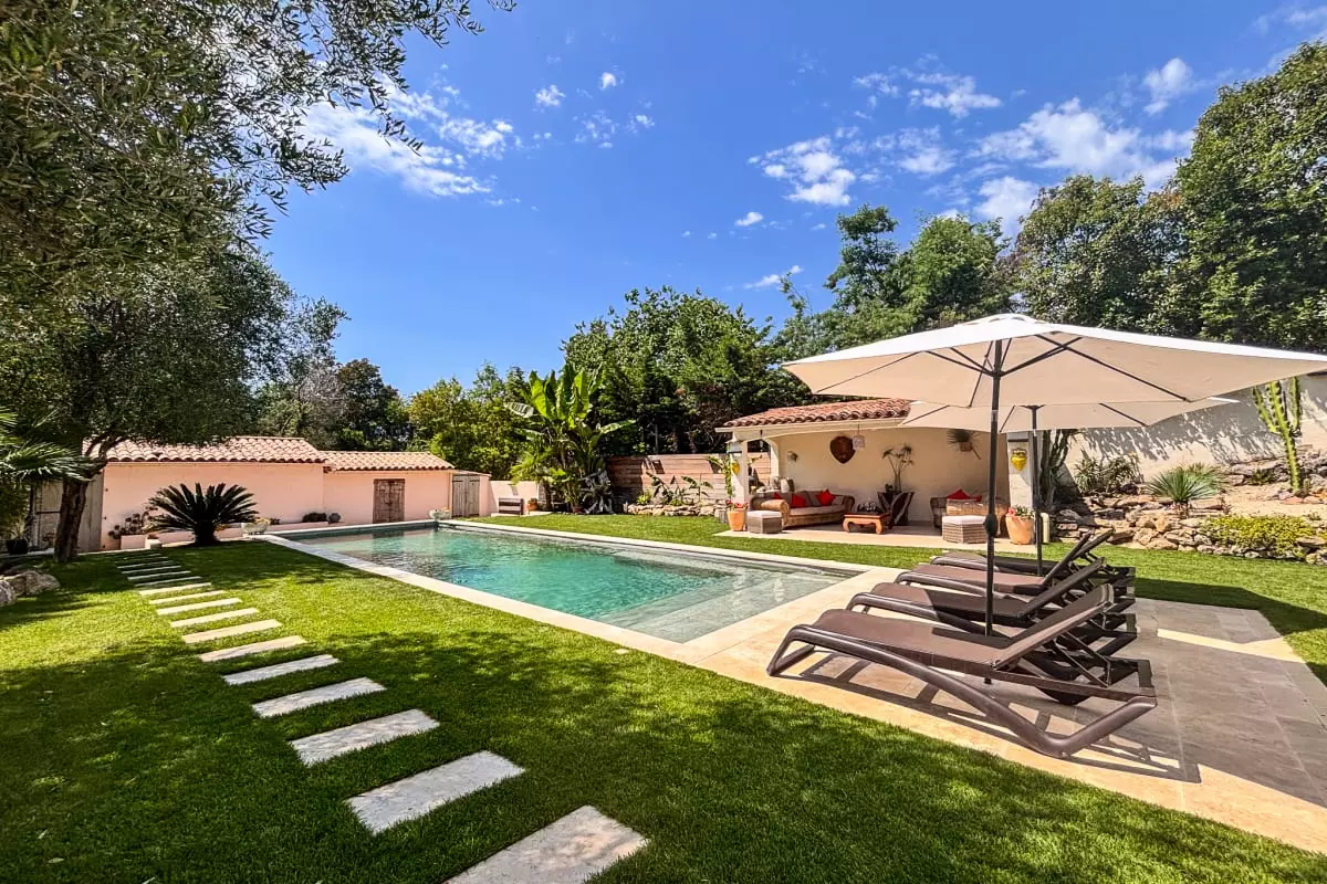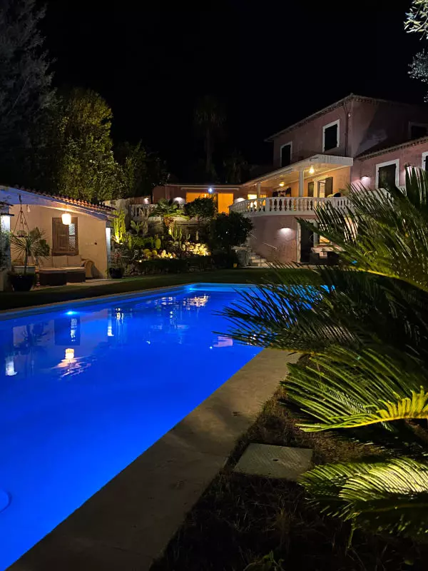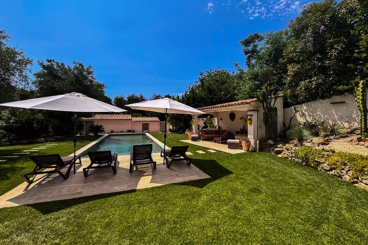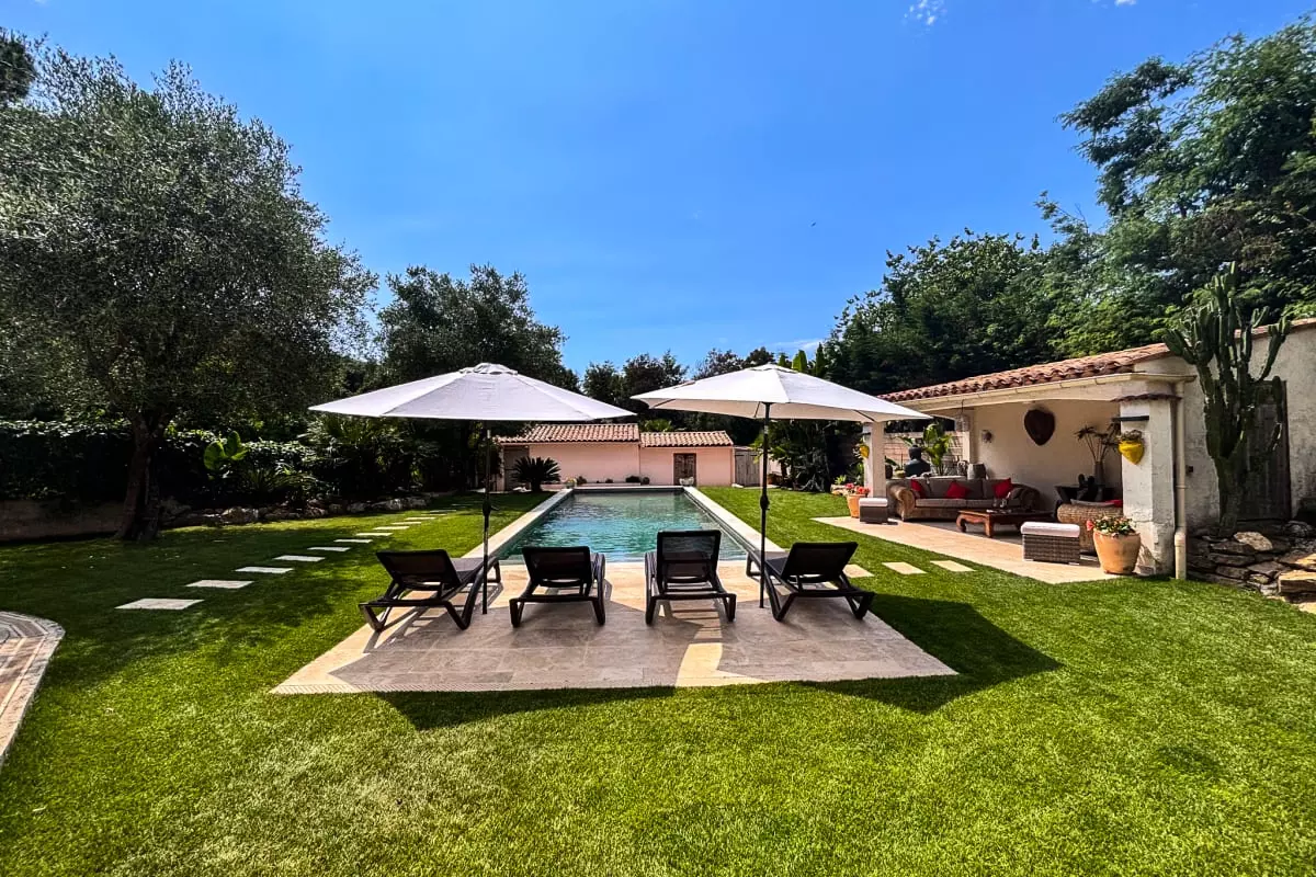 Magnificent entire villa of 180m2 in Mandelieu-La-Nae composed of two large apartments, with private swimming pool, pétanque court, pool house, summer kitchen, terrace, barbecues and to complete a magnificent landscaped garden, you will be in peace while being close to the seaside and all the activities offered as well as shops, bars, restaurants, casino, golf, private beaches.