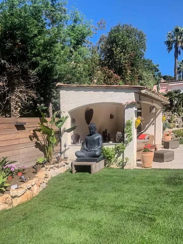 - 1 Large terrace overlooking the garden facing the swimming pool with a large dining table and a gas barbecue