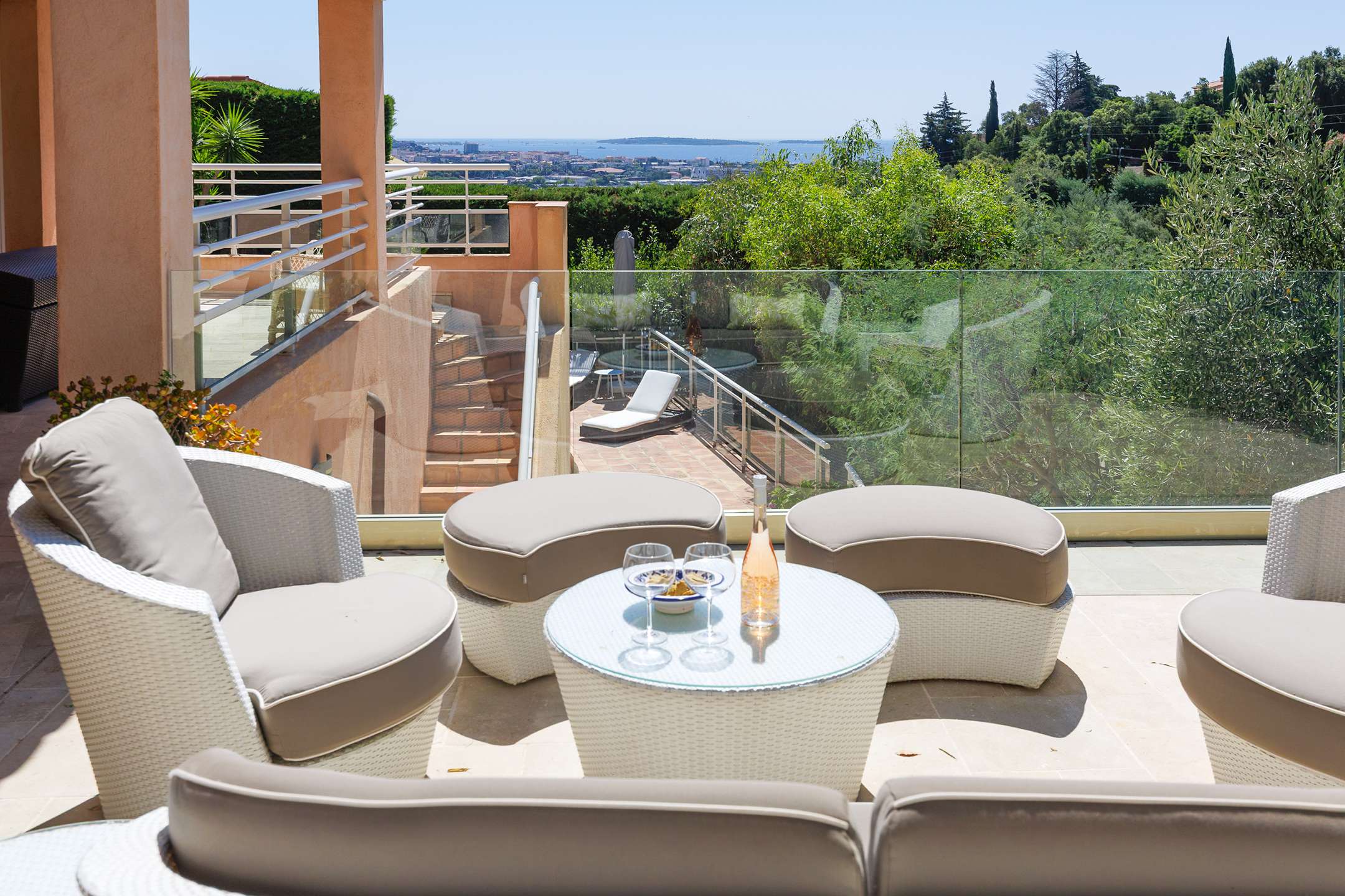This contemporary villa offers a warm and family-friendly setting, where elegance blends seamlessly with functionality. From the moment you arrive, you will be captivated by the abundant natural light and the panoramic sea view over the Lérins Islands—an immediate invitation to relax.