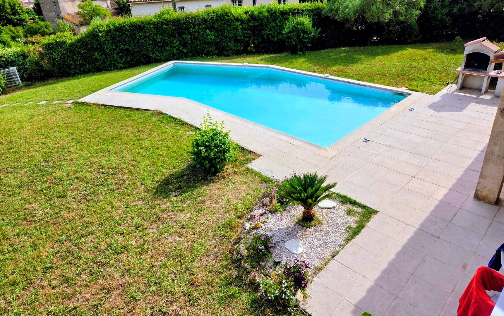 Large garden with private swimming pool and outdoor barbecue