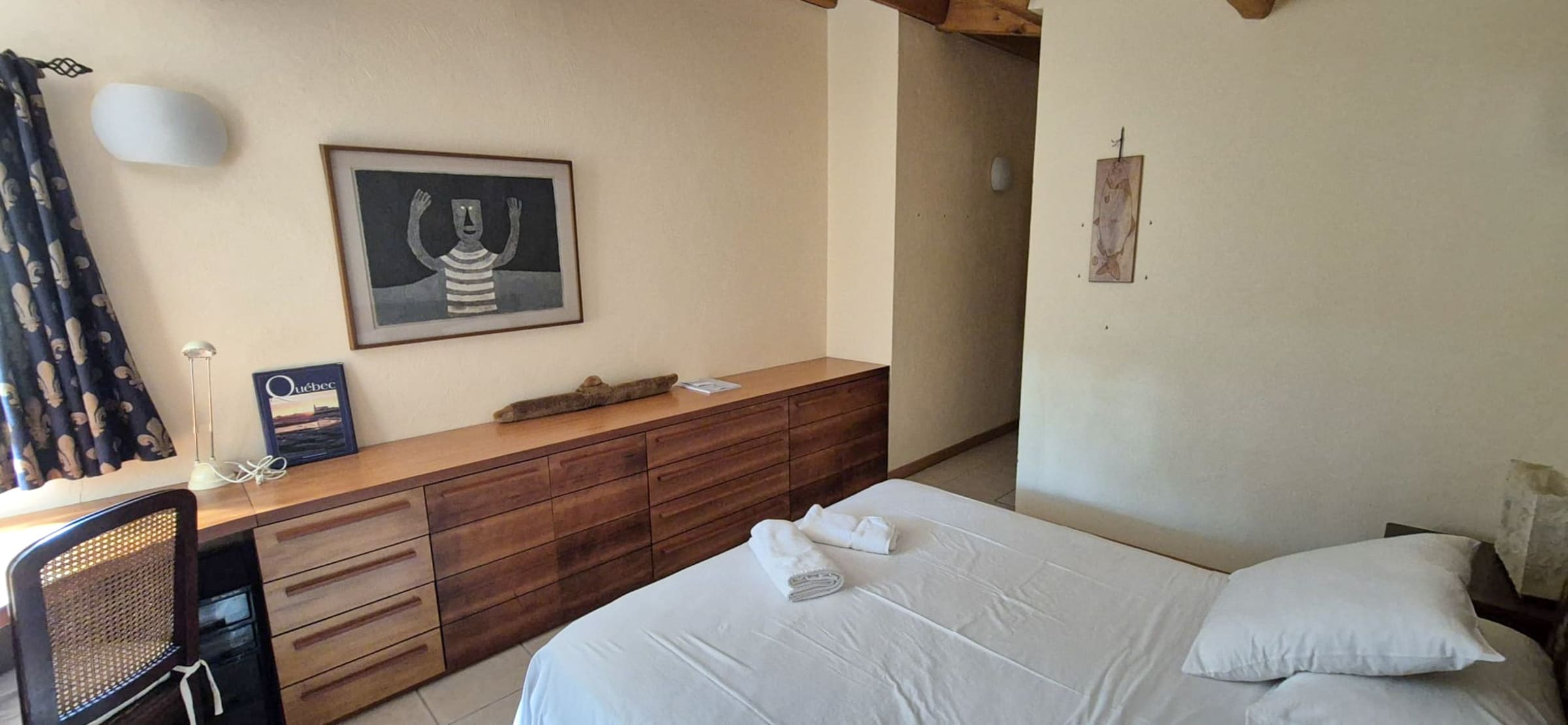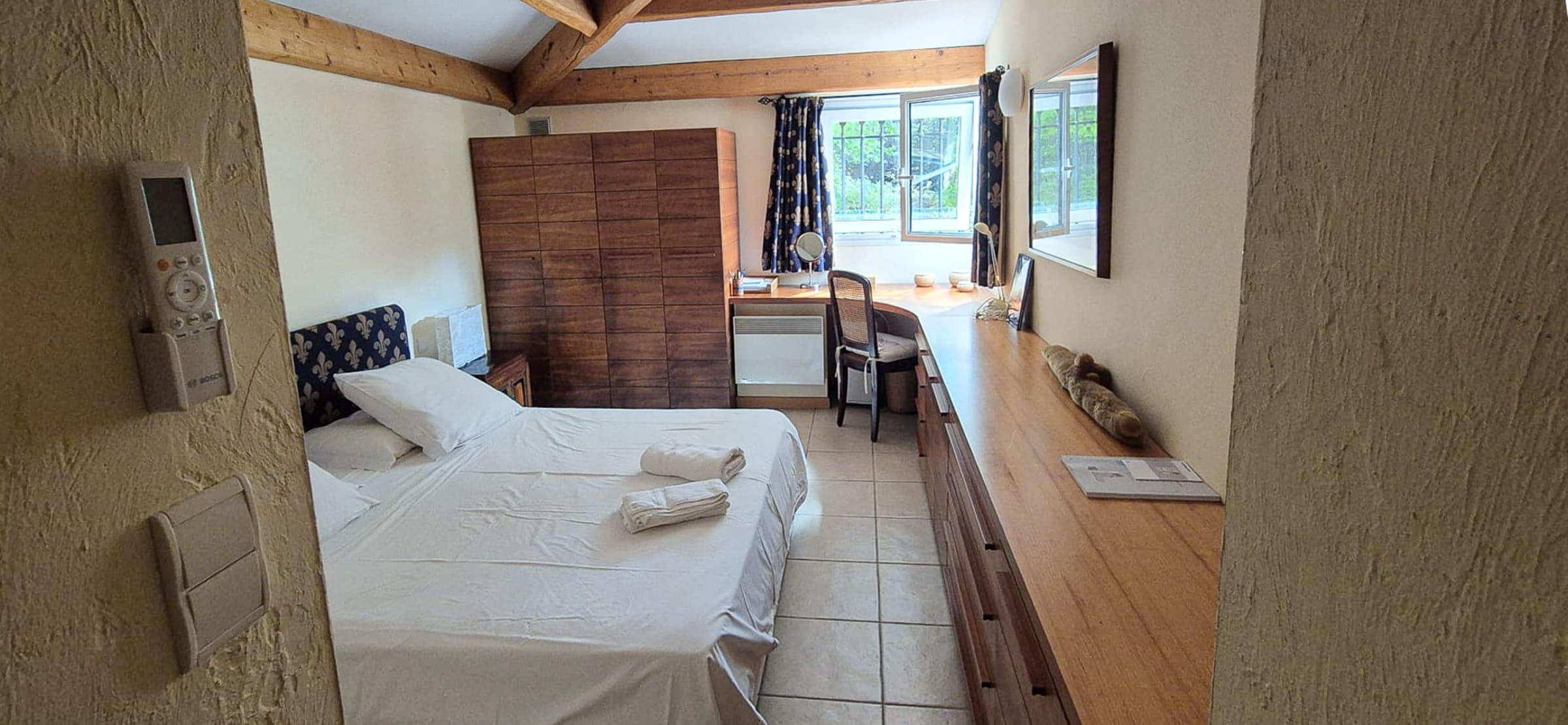 • BEDROOM 2: King-size bed (180x200), AC, desk, and en-suite bathroom