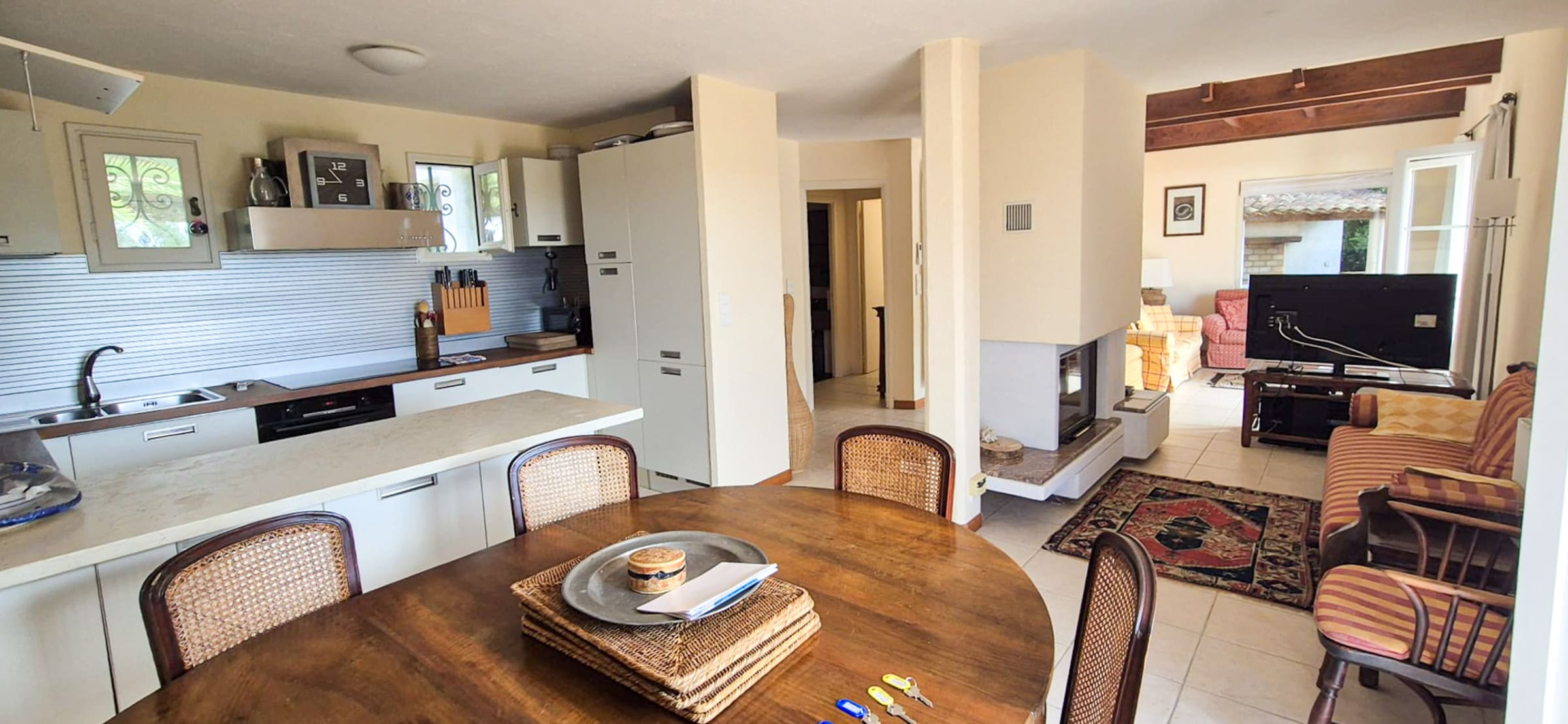 • LARGE LIVING ROOM AC: Large living space with two sofas, a central fireplace, and a dining area opening onto the kitchen and the house's terrace.
